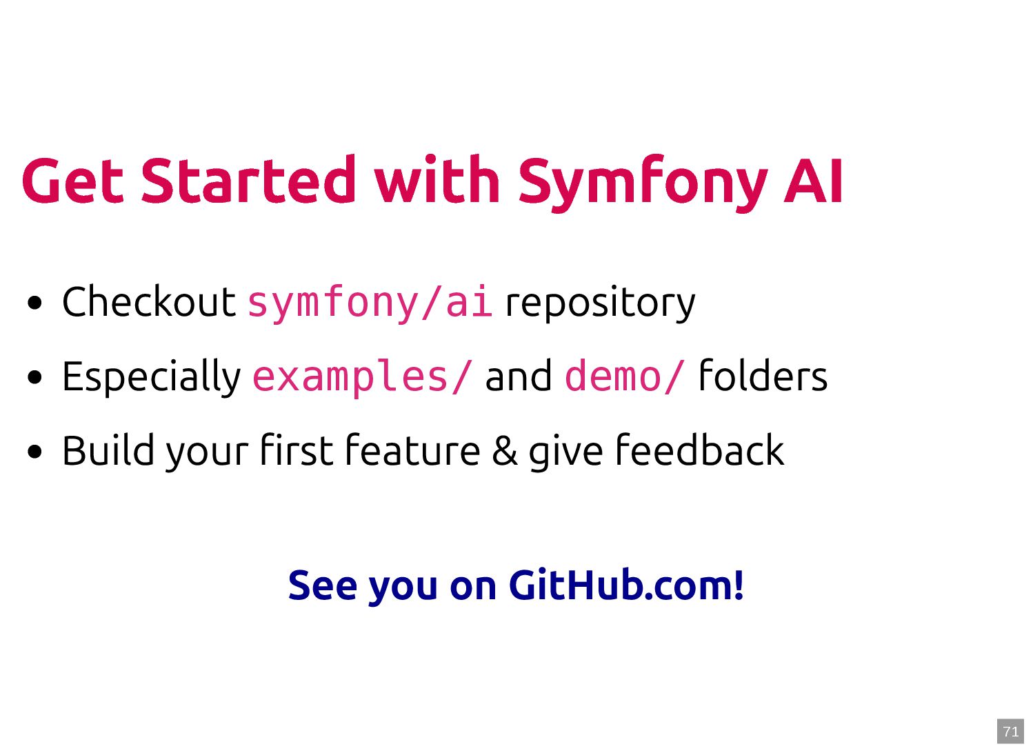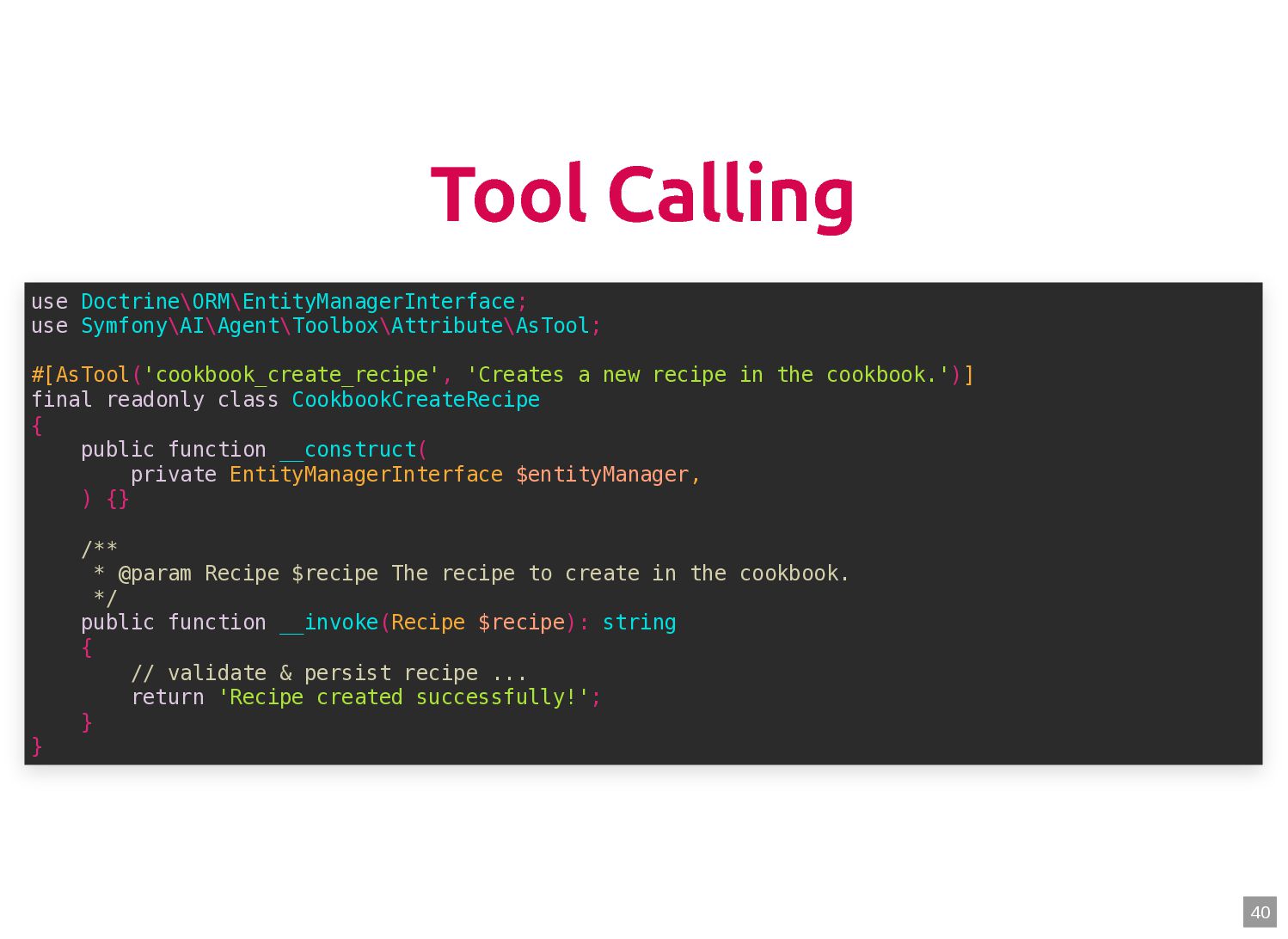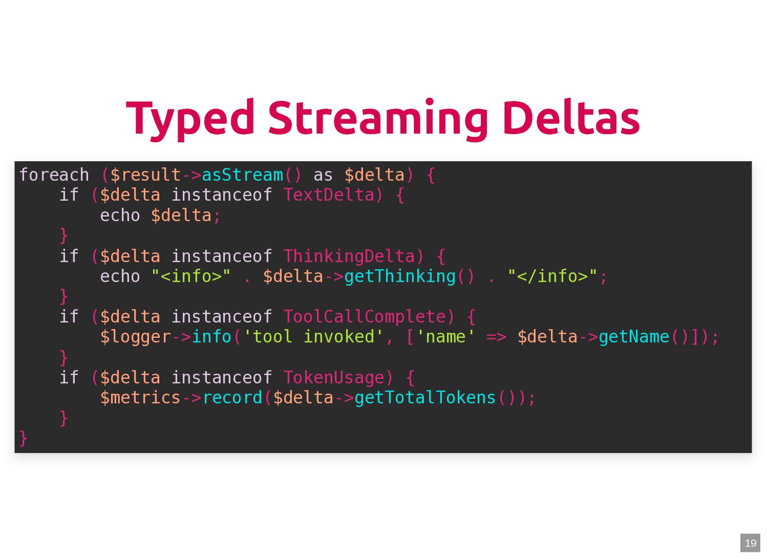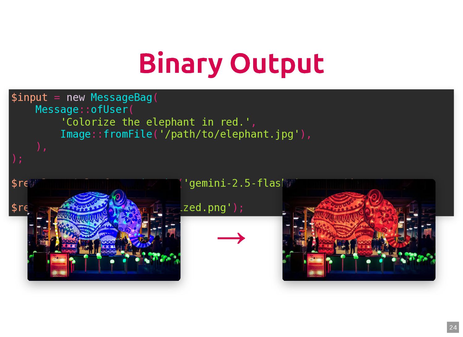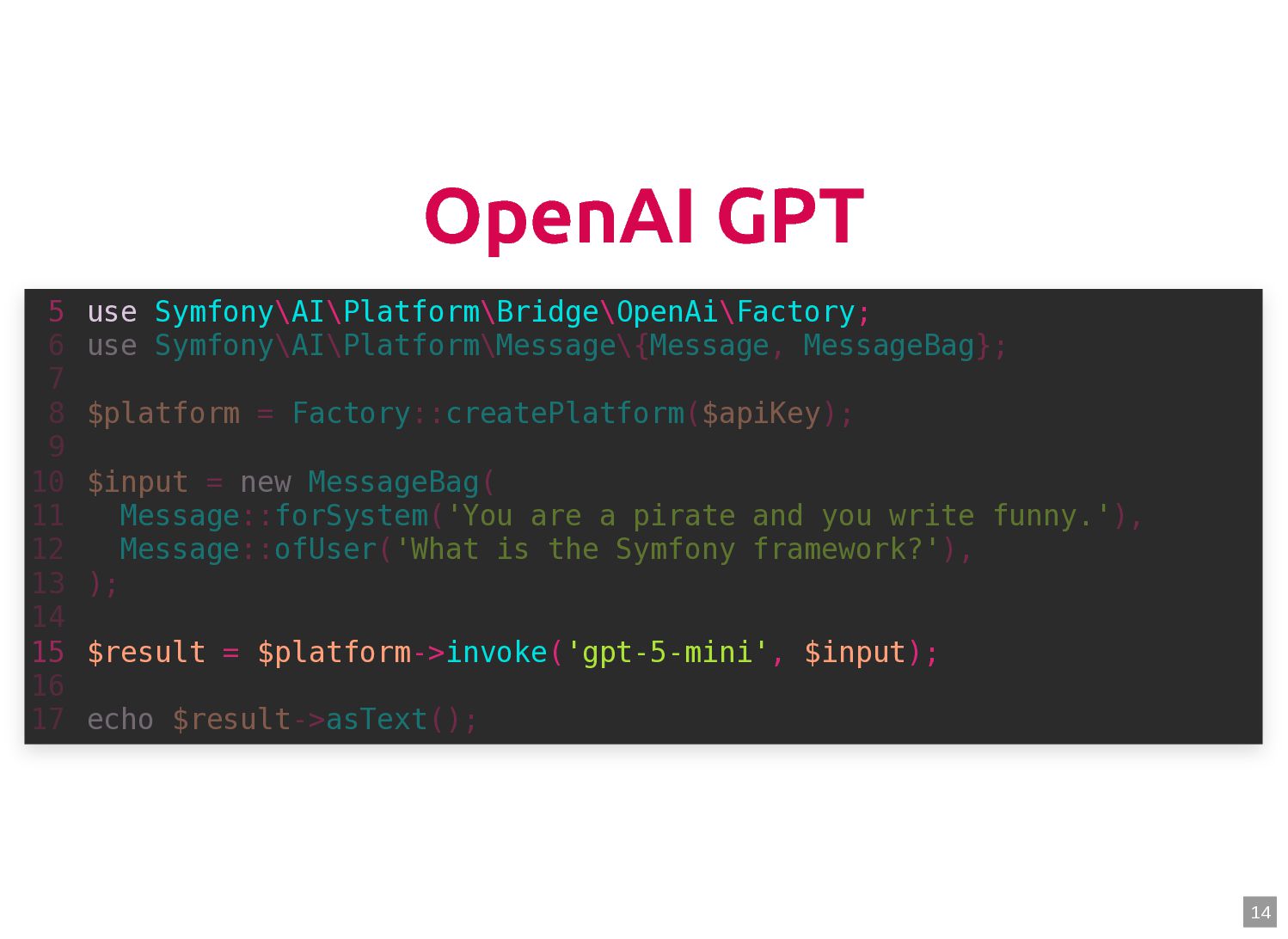 text in, documents out (wraps TextQuery) $documents = $retriever->retrieve('mafia movie'); // Low-level: pick the Query shape yourself $store->query(new TextQuery('mafia movie')); $store->query(new VectorQuery($vectorizer->vectorize('mafia movie'))); $store->query(new HybridQuery( vector: $vectorizer->vectorize('mafia movie'), text: 'mafia movie', semanticRatio: 0.7, // 70% semantic, 30% keyword )); 5 6 7 8 9 10 11 12 13 14 15 16 17 $retriever = new Retriever($store, $vectorizer); 5 6 // High-level: text in, documents out (wraps TextQuery) 7 $documents = $retriever->retrieve('mafia movie'); 8 9 // Low-level: pick the Query shape yourself 10 $store->query(new TextQuery('mafia movie')); 11 $store->query(new VectorQuery($vectorizer->vectorize('mafia movie'))); 12 $store->query(new HybridQuery( 13 vector: $vectorizer->vectorize('mafia movie'), 14 text: 'mafia movie', 15 semanticRatio: 0.7, // 70% semantic, 30% keyword 16 )); 17 $documents = $retriever->retrieve('mafia movie'); $retriever = new Retriever($store, $vectorizer); 5 6 // High-level: text in, documents out (wraps TextQuery) 7 8 9 // Low-level: pick the Query shape yourself 10 $store->query(new TextQuery('mafia movie')); 11 $store->query(new VectorQuery($vectorizer->vectorize('mafia movie'))); 12 $store->query(new HybridQuery( 13 vector: $vectorizer->vectorize('mafia movie'), 14 text: 'mafia movie', 15 semanticRatio: 0.7, // 70% semantic, 30% keyword 16 )); 17 $store->query(new TextQuery('mafia movie')); $retriever = new Retriever($store, $vectorizer); 5 6 // High-level: text in, documents out (wraps TextQuery) 7 $documents = $retriever->retrieve('mafia movie'); 8 9 // Low-level: pick the Query shape yourself 10 11 $store->query(new VectorQuery($vectorizer->vectorize('mafia movie'))); 12 $store->query(new HybridQuery( 13 vector: $vectorizer->vectorize('mafia movie'), 14 text: 'mafia movie', 15 semanticRatio: 0.7, // 70% semantic, 30% keyword 16 )); 17 $store->query(new VectorQuery($vectorizer->vectorize('mafia movie'))); $retriever = new Retriever($store, $vectorizer); 5 6 // High-level: text in, documents out (wraps TextQuery) 7 $documents = $retriever->retrieve('mafia movie'); 8 9 // Low-level: pick the Query shape yourself 10 $store->query(new TextQuery('mafia movie')); 11 12 $store->query(new HybridQuery( 13 vector: $vectorizer->vectorize('mafia movie'), 14 text: 'mafia movie', 15 semanticRatio: 0.7, // 70% semantic, 30% keyword 16 )); 17 $store->query(new HybridQuery( vector: $vectorizer->vectorize('mafia movie'), text: 'mafia movie', semanticRatio: 0.7, // 70% semantic, 30% keyword )); $retriever = new Retriever($store, $vectorizer); 5 6 // High-level: text in, documents out (wraps TextQuery) 7 $documents = $retriever->retrieve('mafia movie'); 8 9 // Low-level: pick the Query shape yourself 10 $store->query(new TextQuery('mafia movie')); 11 $store->query(new VectorQuery($vectorizer->vectorize('mafia movie'))); 12 13 14 15 16 17 60