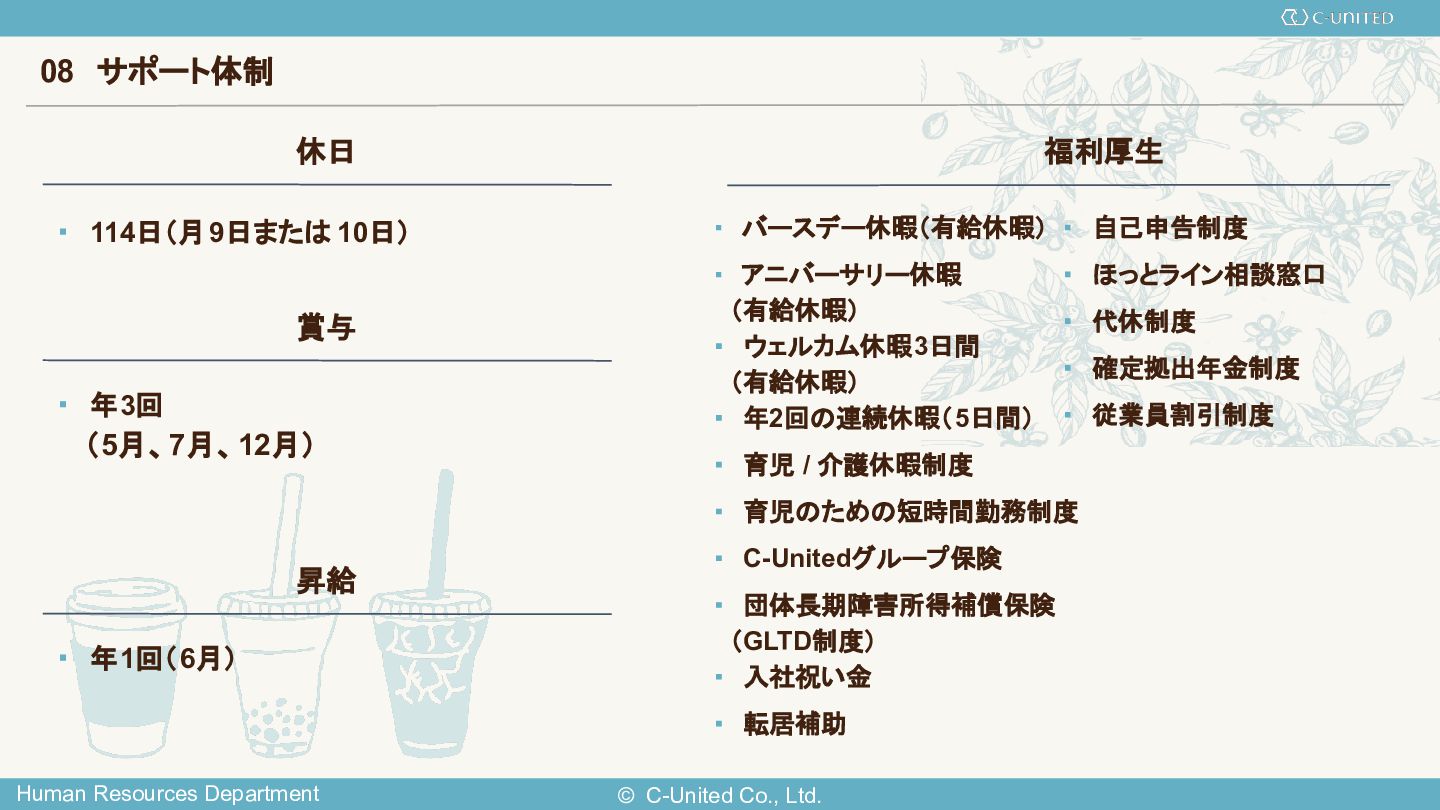 12. © C-United Co., Ltd. Human Resources Department 08 サポート体制 休日 ・ 114日(月9日または