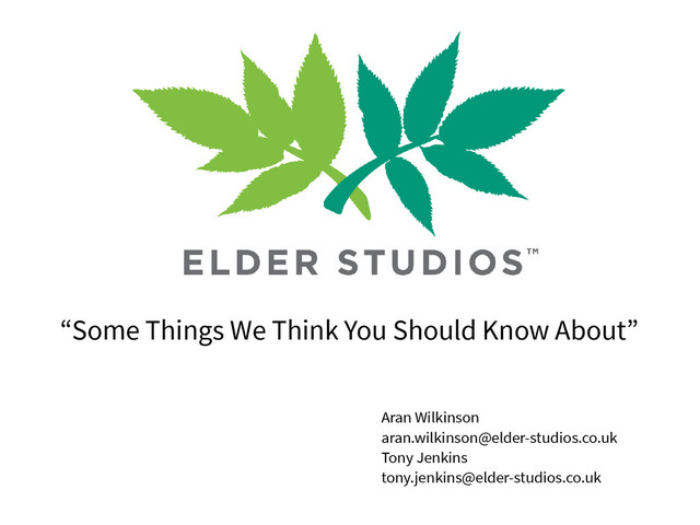 Build Software systems for clients. Use Open Source Technologies. Adopt Agile methods and tools. Have free pizza for Tuesday lunch. Elder Studios The Media Centre 7 Northumberland Street Huddersfield Yorkshire HD1 1RL T: 01484 483042 E: [email protected] W: www.elder-studios.co.uk F: elderstudiosltd T: @ElderStudiosLtd L: elder-studios-ltd