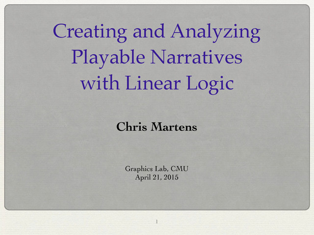 computational concurrency, can be used to encode a narrative space in such a way that we can a) run a proof search algorithm to generate different narratives, and b) analyze causal structure. I will then discuss ongoing work in developing a programming language based on linear logic, with the aim of supporting a broad range of idioms in interactive simulation and game design.