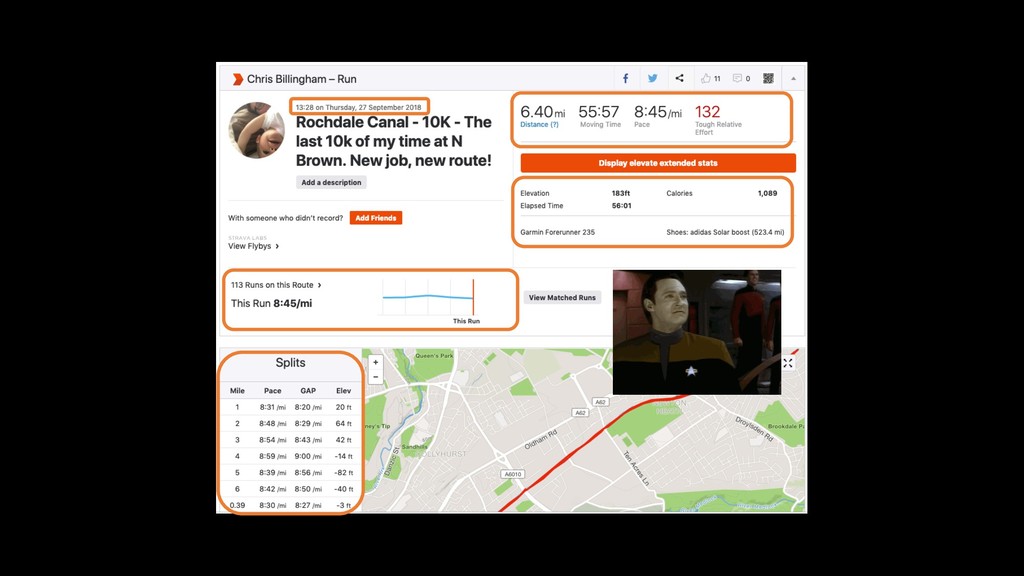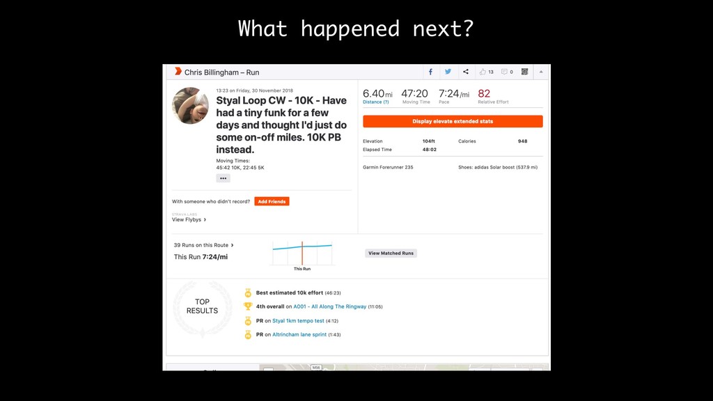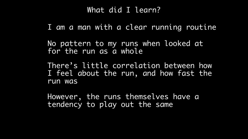 clear running routine No pattern to my runs when looked at for the run as a whole There’s little correlation between how I feel about the run, and how fast the run was However, the runs themselves have a tendency to play out the same