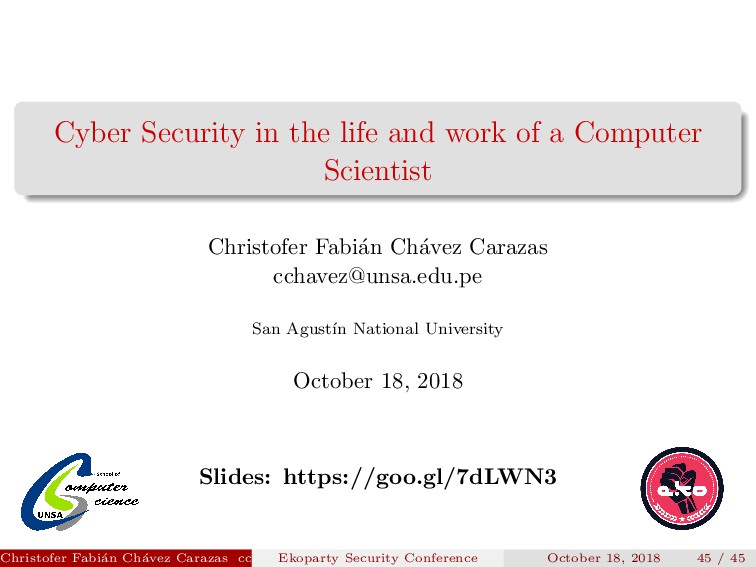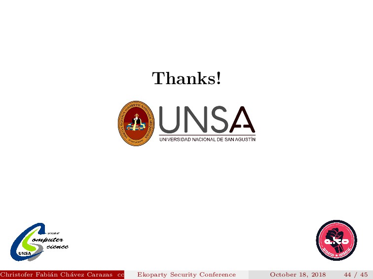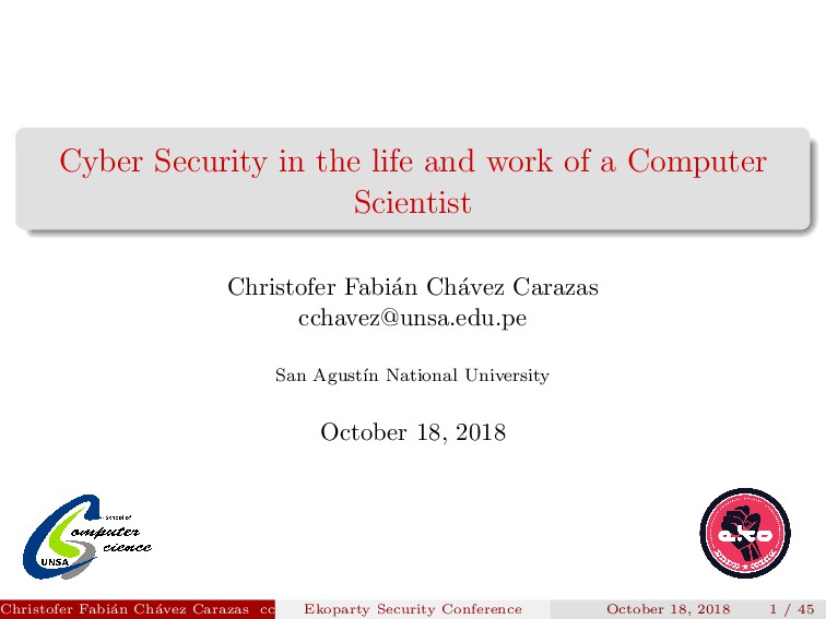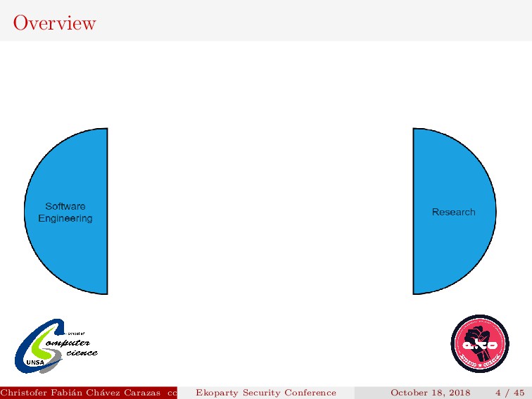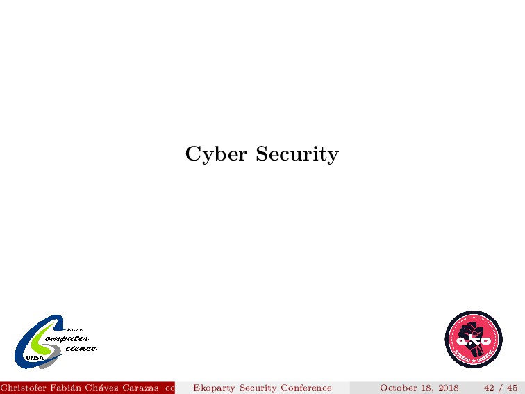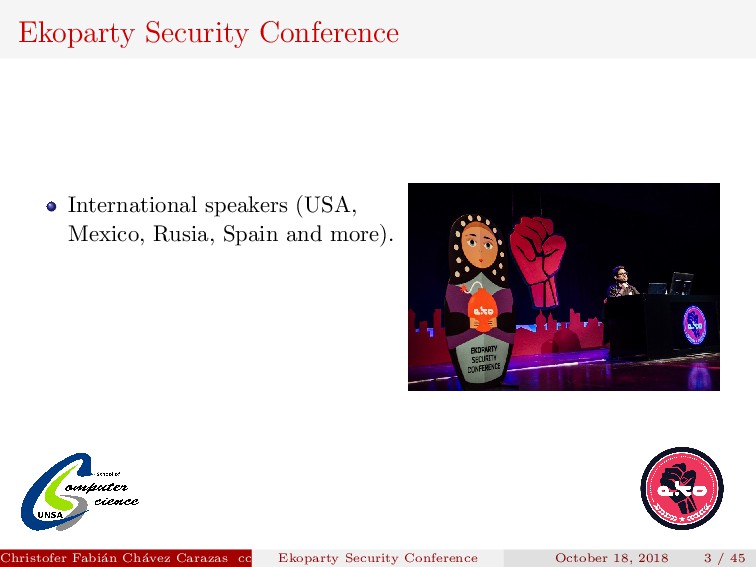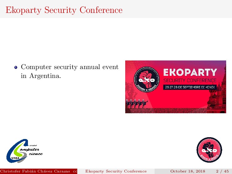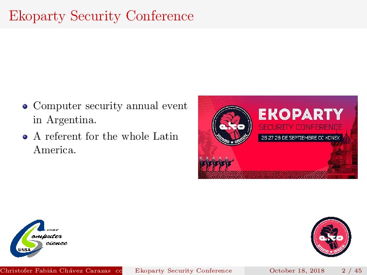 referent for the whole Latin America. Christofer Fabi´ an Ch´ avez Carazas [email protected] (San Agust´ ın National University) Ekoparty Security Conference October 18, 2018 2 / 45