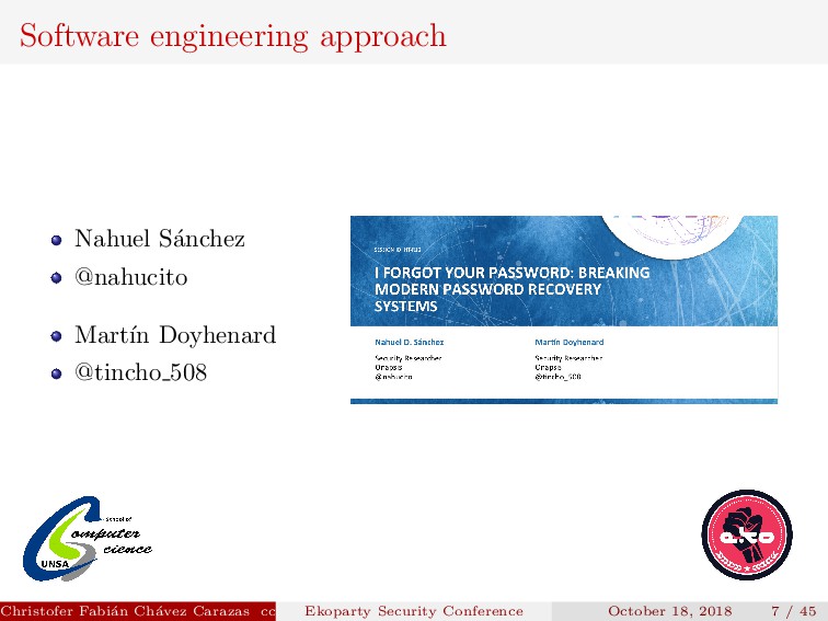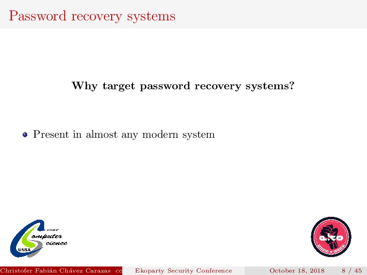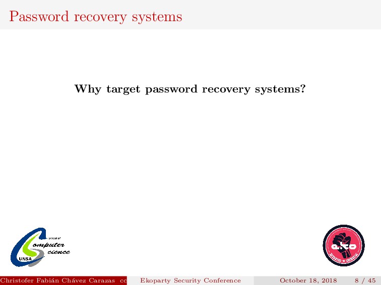 to implement. Security depends on how the new password is transmitted. Christofer Fabi´ an Ch´ avez Carazas [email protected] (San Agust´ ın National University) Ekoparty Security Conference October 18, 2018 23 / 45
