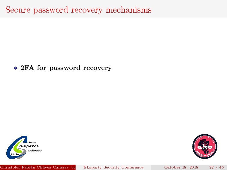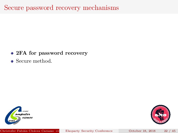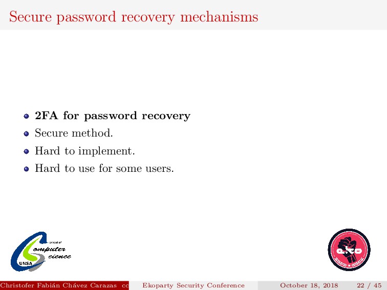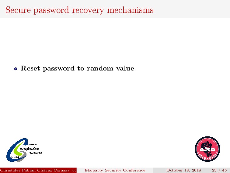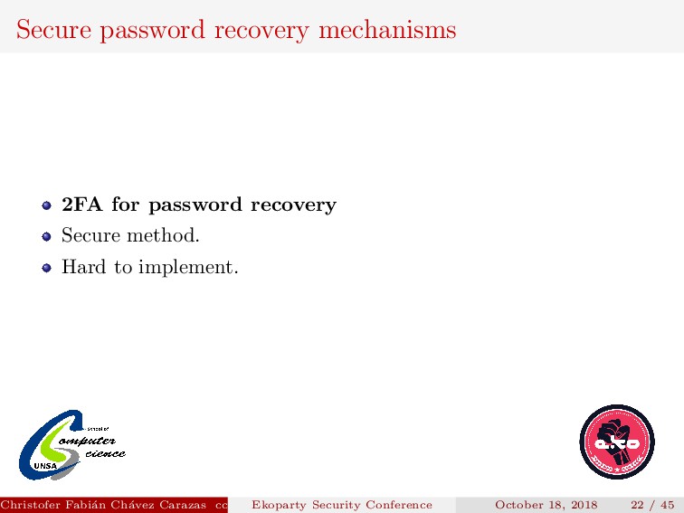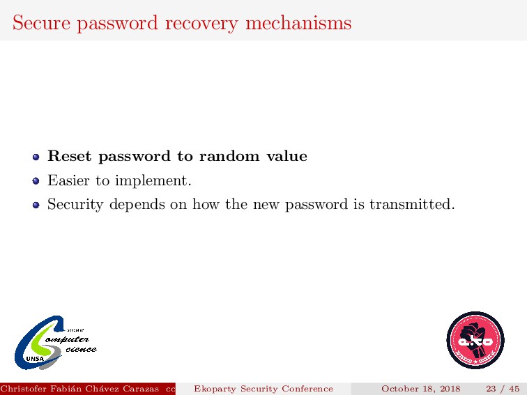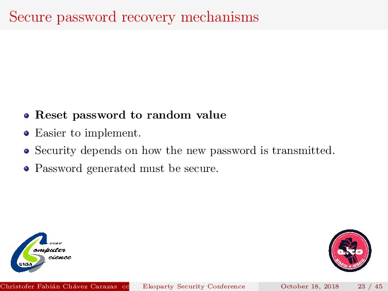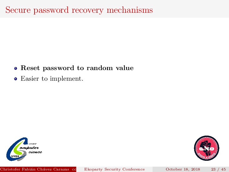 to implement. Security depends on how the new password is transmitted. Password generated must be secure. Christofer Fabi´ an Ch´ avez Carazas [email protected] (San Agust´ ın National University) Ekoparty Security Conference October 18, 2018 23 / 45