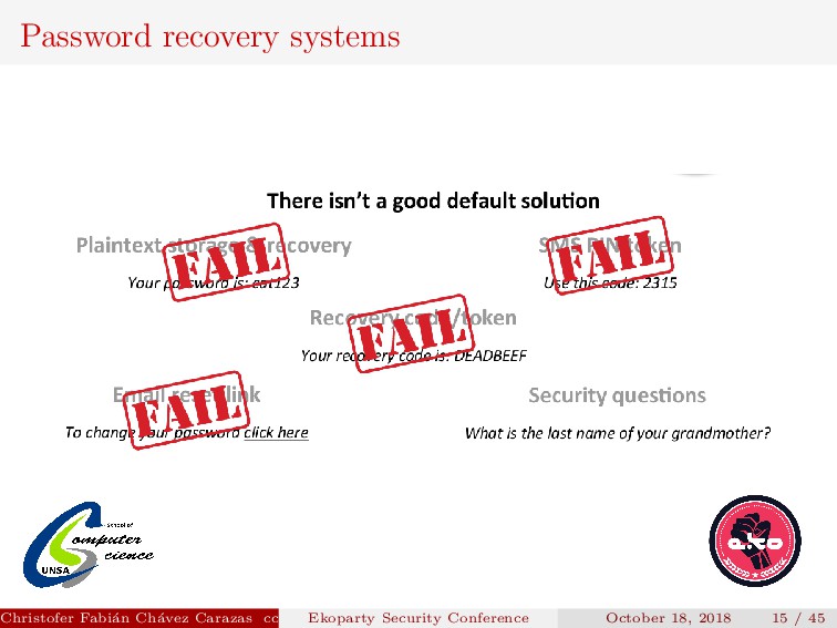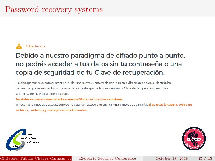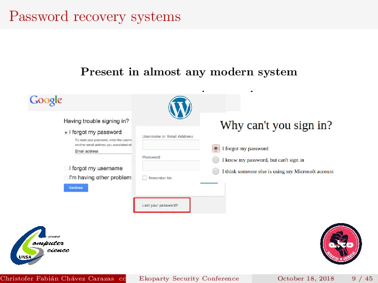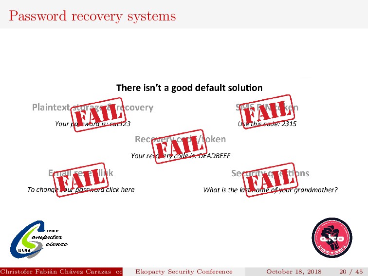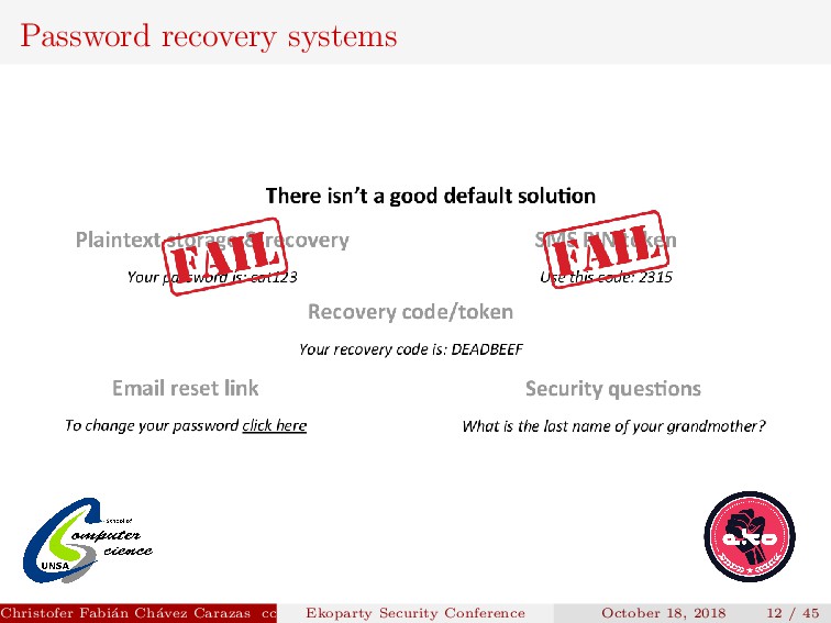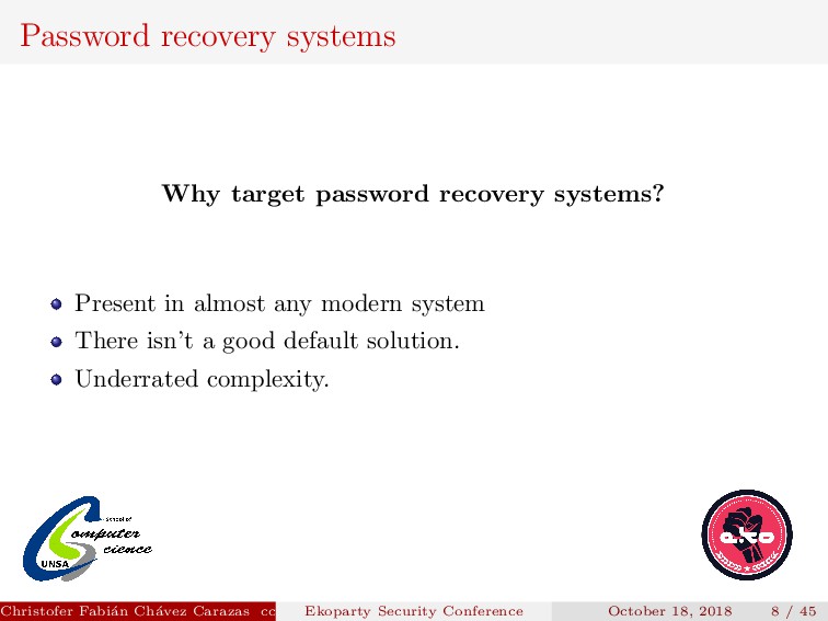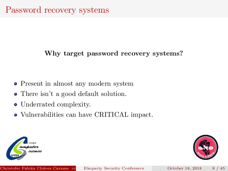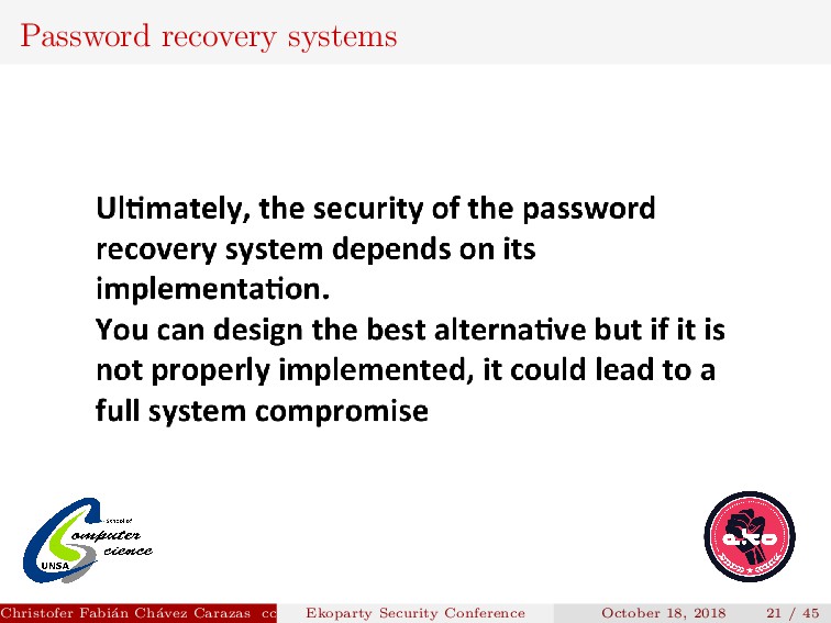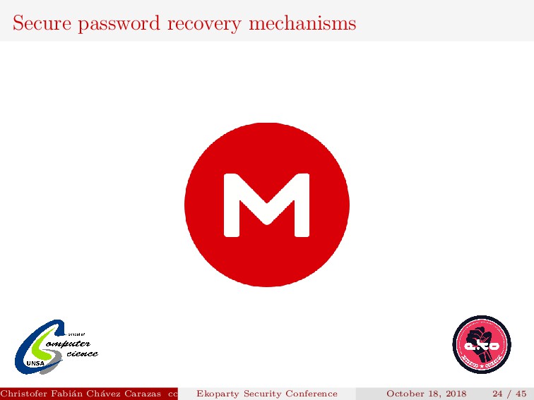 to implement. Security depends on how the new password is transmitted. Password generated must be secure. Christofer Fabi´ an Ch´ avez Carazas [email protected] (San Agust´ ın National University) Ekoparty Security Conference October 18, 2018 23 / 45