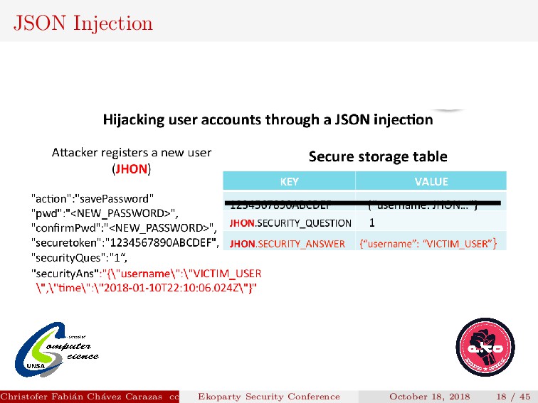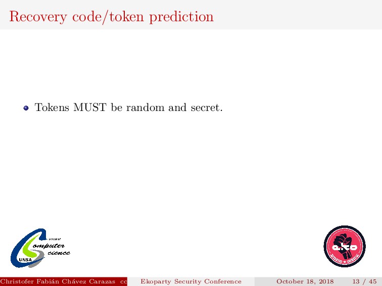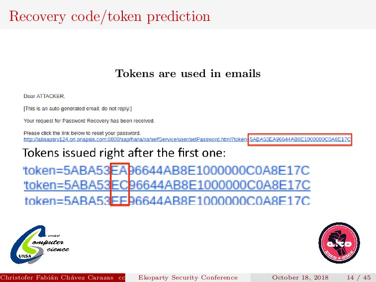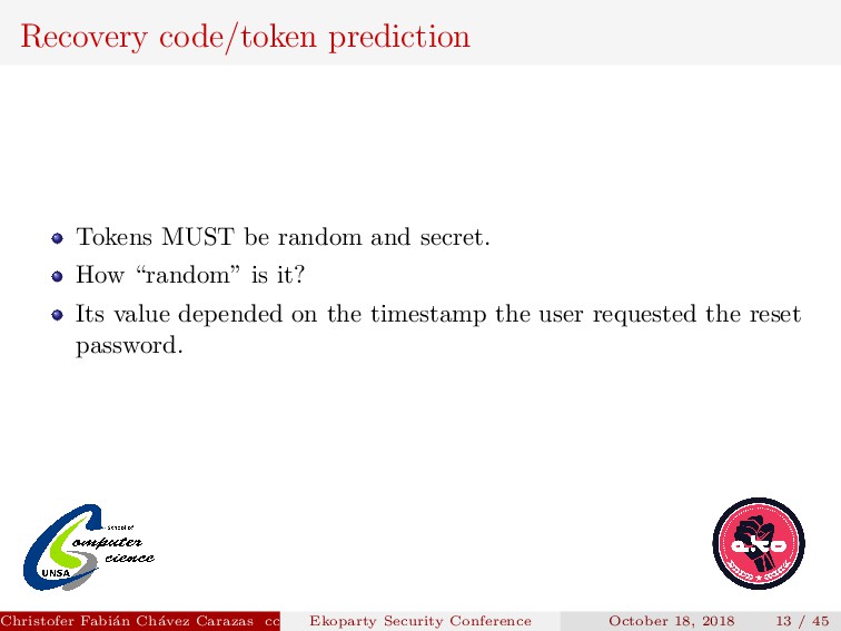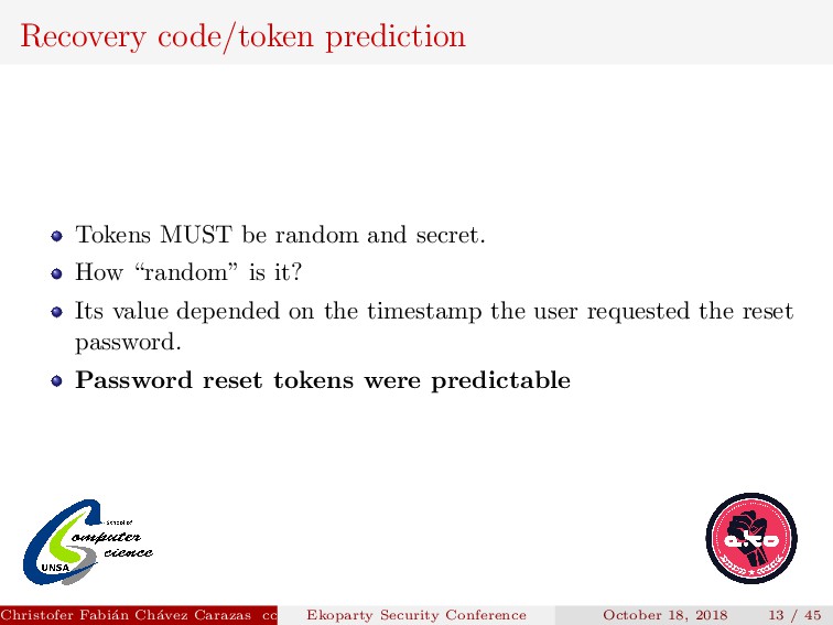 “random” is it? Its value depended on the timestamp the user requested the reset password. Christofer Fabi´ an Ch´ avez Carazas [email protected] (San Agust´ ın National University) Ekoparty Security Conference October 18, 2018 13 / 45