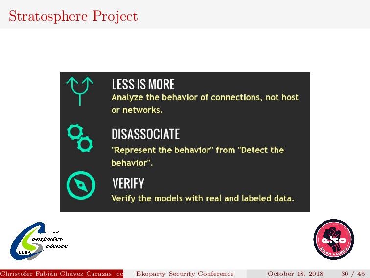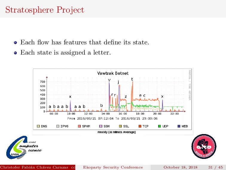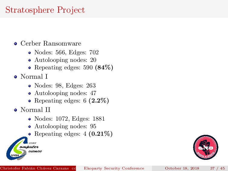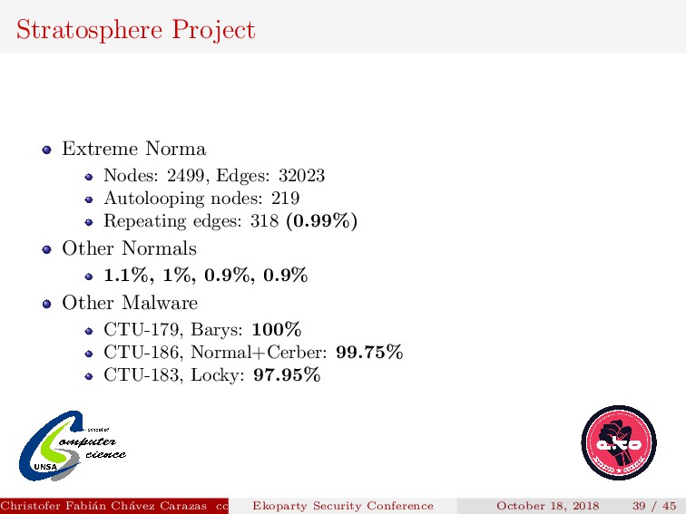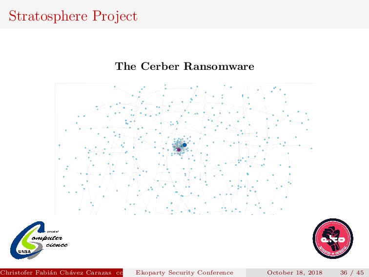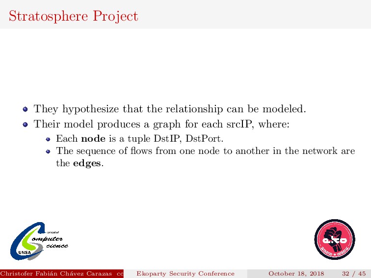 Their model produces a graph for each srcIP, where: Each node is a tuple DstIP, DstPort. The sequence of flows from one node to another in the network are the edges. Christofer Fabi´ an Ch´ avez Carazas [email protected] (San Agust´ ın National University) Ekoparty Security Conference October 18, 2018 32 / 45