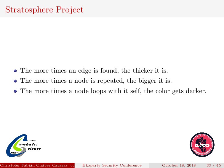 thicker it is. The more times a node is repeated, the bigger it is. The more times a node loops with it self, the color gets darker. Christofer Fabi´ an Ch´ avez Carazas [email protected] (San Agust´ ın National University) Ekoparty Security Conference October 18, 2018 33 / 45