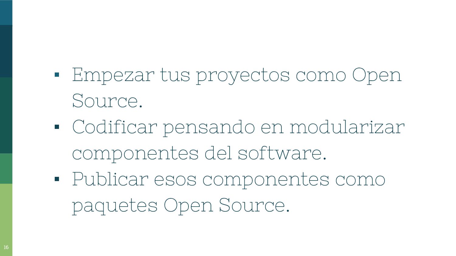 He hablado sobre el software libre y open source.He hablado de sus diferencias. Además he dado pautas para que una persona pueda dar su primer paso en su primera contribución al mundo del open source. Finalizando, he explicado mi experiencia como desarrollador Open Source en Opencraft