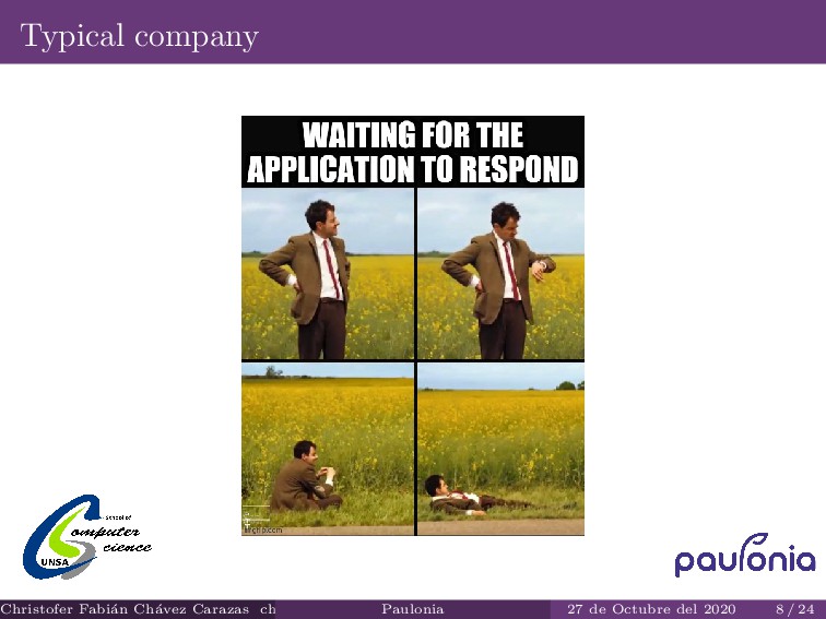 Officially: 4 months; Not Officially: 8 months Clients from Per´ u and United States Own projects Team of 6; 2 internships Christofer Fabi´ an Ch´ avez Carazas [email protected] (Paulonia) Paulonia 27 de Octubre del 2020 15 / 24