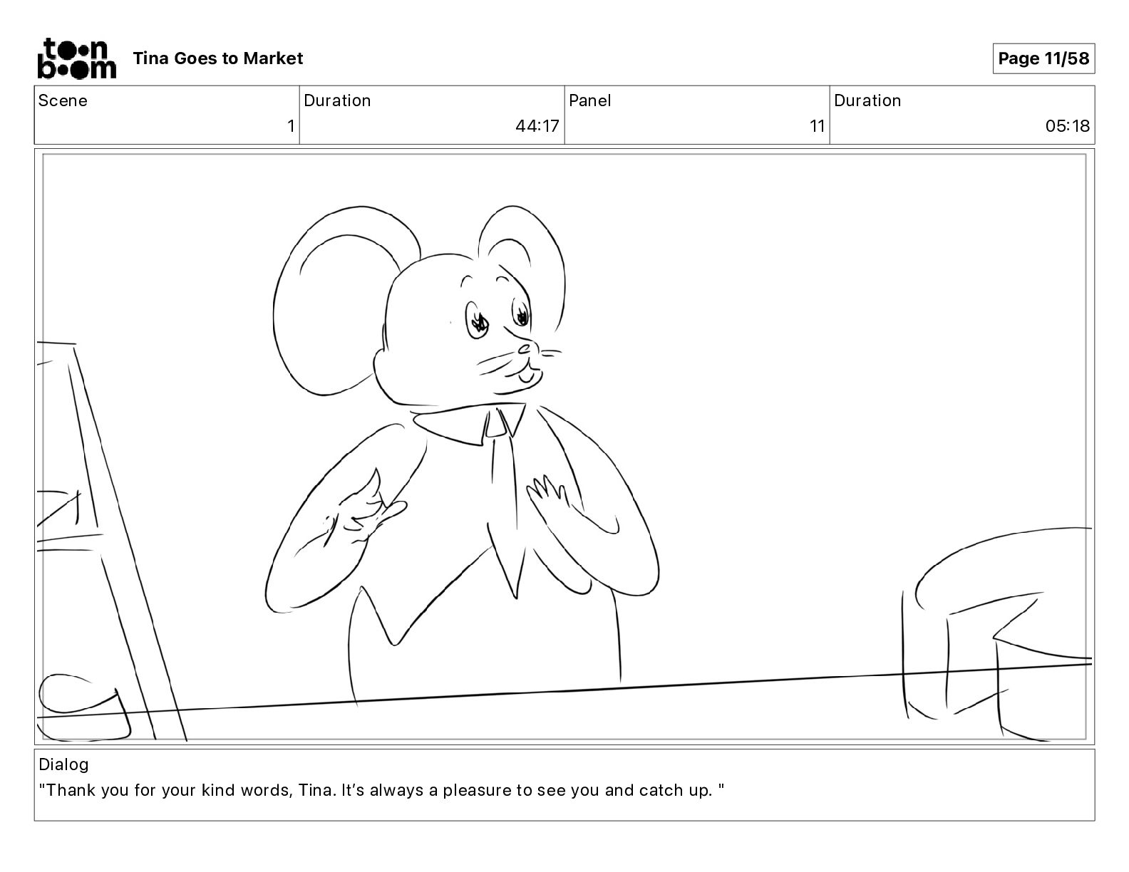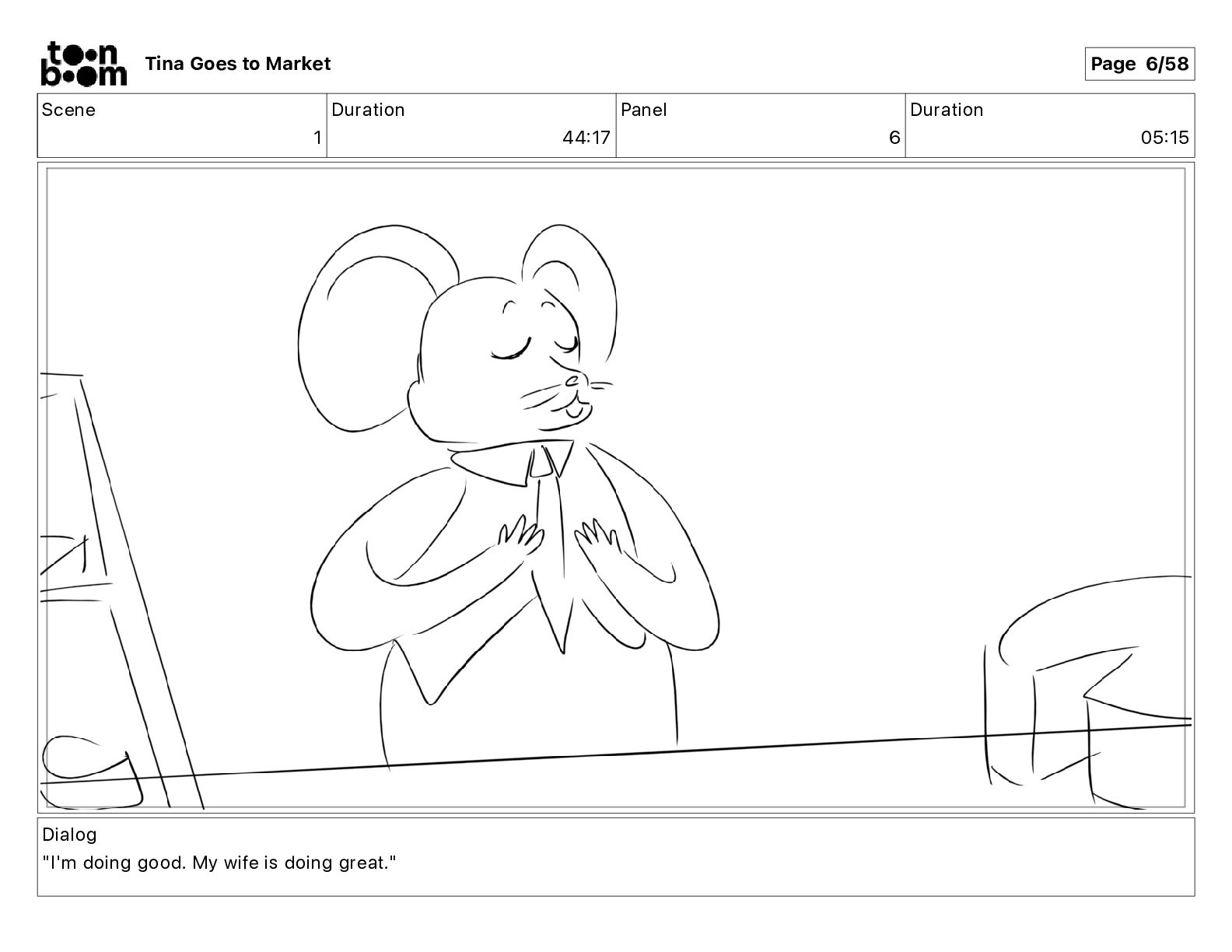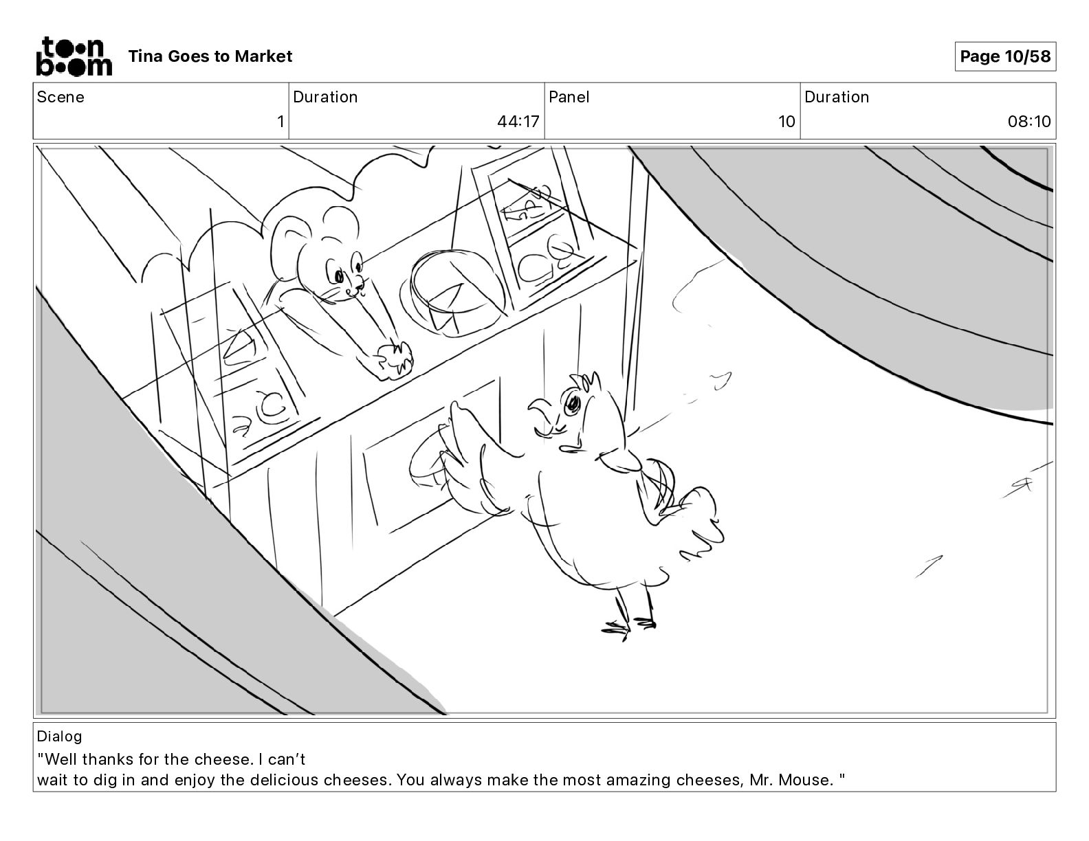 Dialog "Well thanks for the cheese. I canʼt wait to dig in and enjoy the delicious cheeses. You always make the most amazing cheeses, Mr. Mouse. " Tina Goes to Market Page 10/58