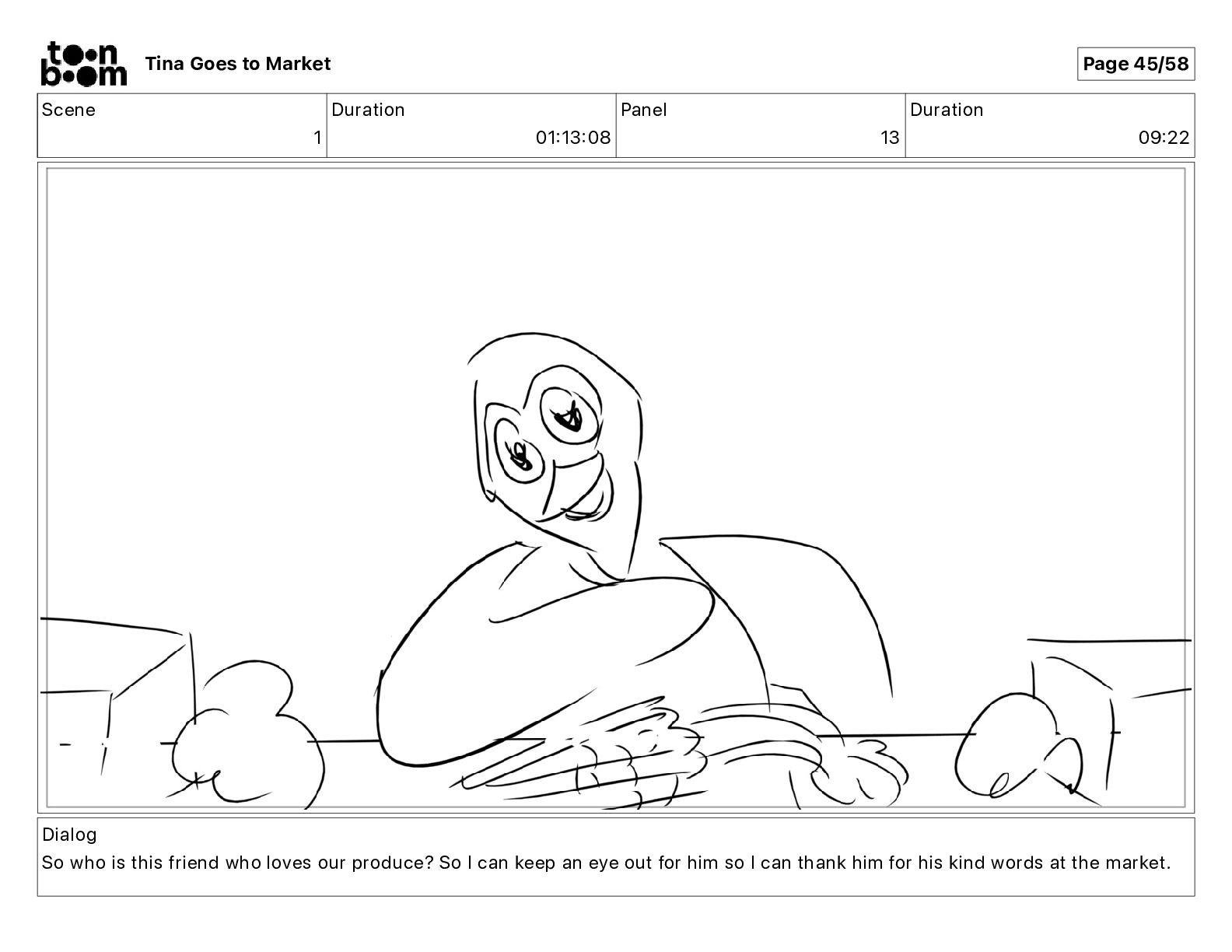 22 Dialog So who is this friend who loves our produce? So I can keep an eye out for him so I can thank him for his kind words at the market. Tina Goes to Market Page 45/58