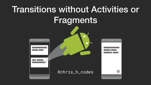 Android's Transition framework is extremely powerful, but almost all examples involve the use of Activities and Fragments. In a world where many developers are now foregoing Fragments, this talk aims to provide some solid examples and strategies on how to use Transitions without them.