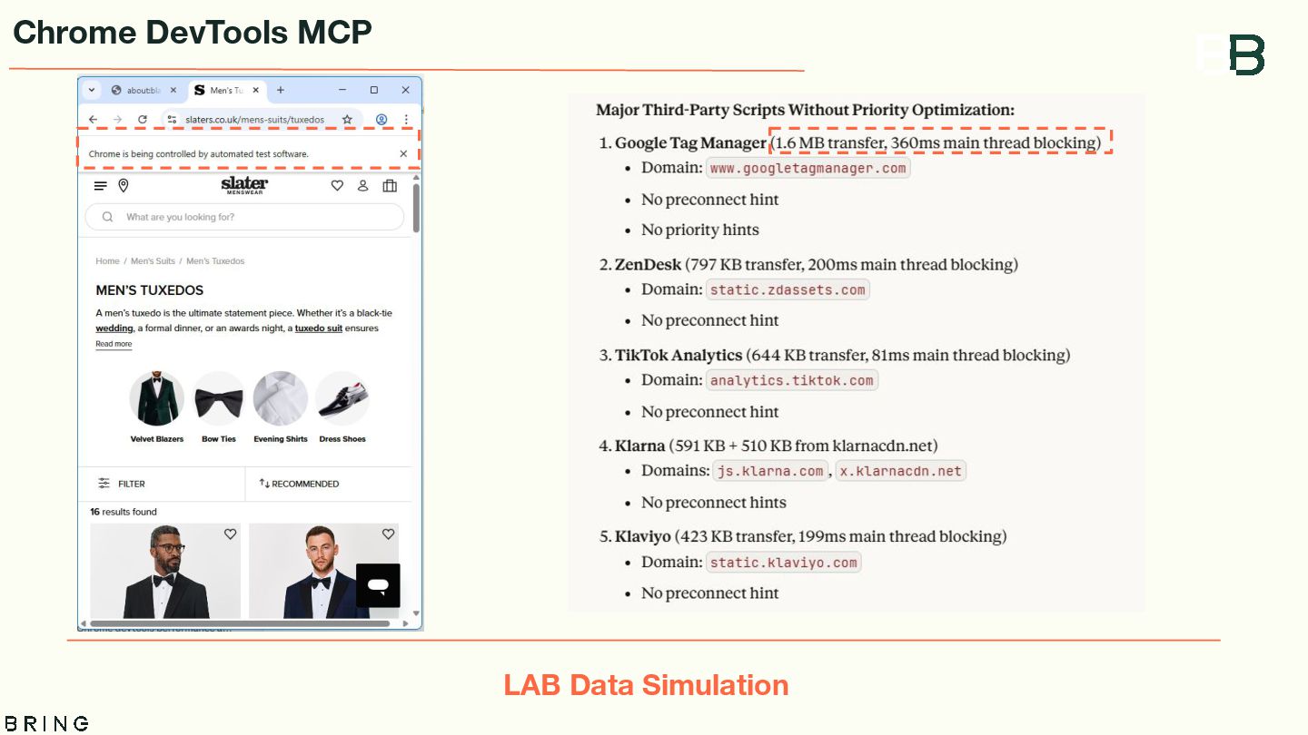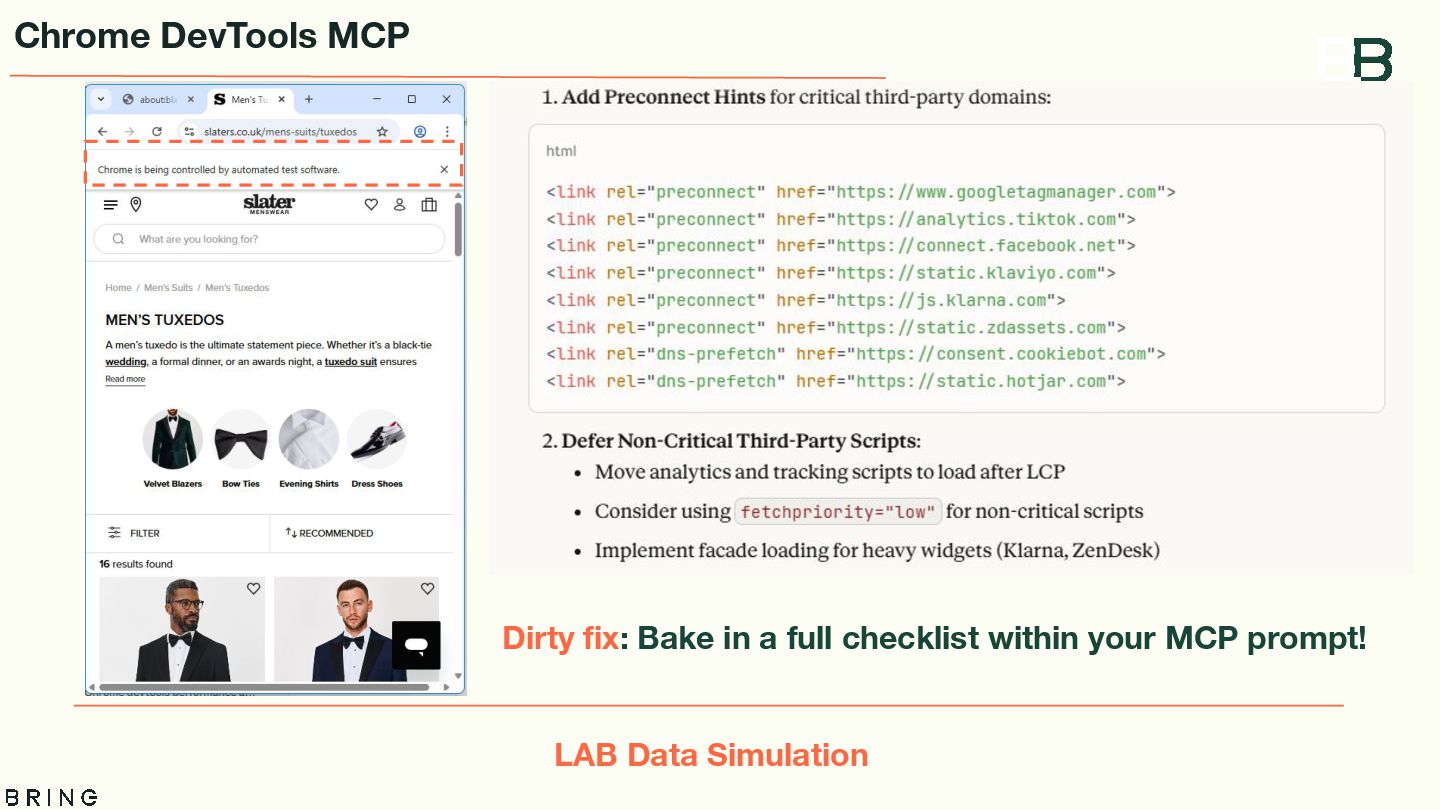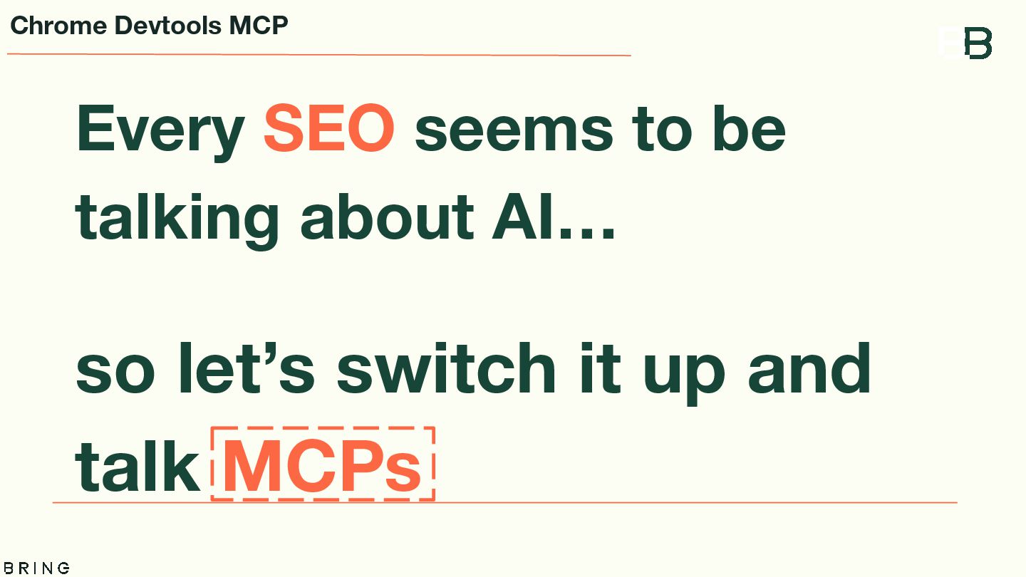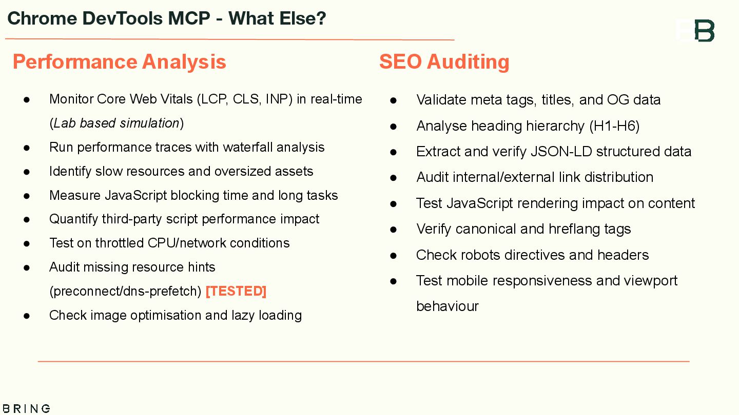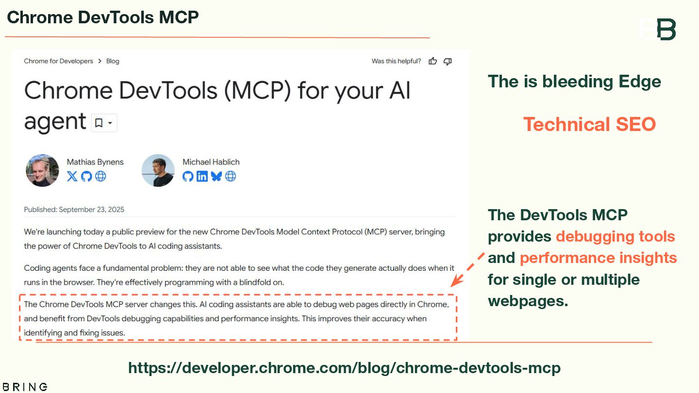 One of my agenda points is the shiny new DevTools MCP. I’ve been digging into it already, and I love what it brings for performance analysis and SEO auditing.