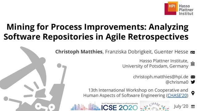 Presentation slides for the CHASE 2020 paper “Mining for Process Improvements: Analyzing Software Repositories in Agile Retrospectives,” C. Matthies, F. Dobrigkeit, and G. Hesse, in IEEE/ACM 42nd International Conference on Software Engineering Workshops, ACM Press, 2020. doi: https://doi.org/10.1145/3387940.3392168