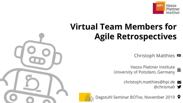 widely used in software teams ▪ Bots ➞ “virtual team members” [Lebeuf et al., 2017] □ Remote team member who only chats □ More team capacity! □ Give new (bot) team member development process analysis role [Lebeuf et al., 2017] Lebeuf, C. & Storey, M.-A. & Zagalsky, A., “How Software Developers Mitigate Collaboration Friction with Chatbots”, Talking with Conversational Agents in Collaborative Action Workshop @ CSCW'17, 2017.