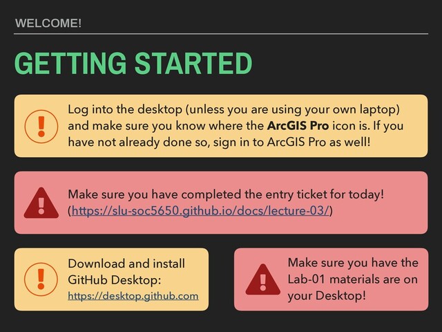 (https://slu-soc5650.github.io/docs/lecture-03/) Log into the desktop (unless you are using your own laptop) and make sure you know where the ArcGIS Pro icon is. If you have not already done so, sign in to ArcGIS Pro as well! WELCOME! GETTING STARTED Make sure you have the Lab-01 materials are on your Desktop! Download and install GitHub Desktop: https://desktop.github.com