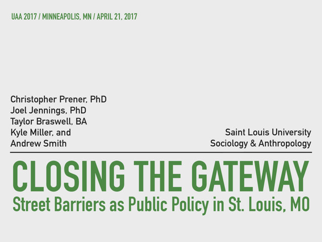 This presentation from the 2017 Urban Affairs Association annual meeting describes the systematic closure of streets in St. Louis, Missouri. We also present initial analyses showing that, at the neighborhood level, higher numbers of closures are not associated with lower levels of crime.