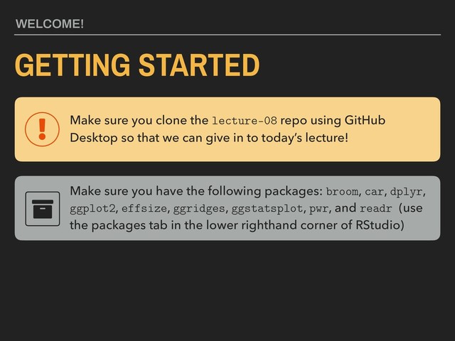 so that we can give in to today’s lecture! WELCOME! GETTING STARTED Make sure you have the following packages: broom, car, dplyr, ggplot2, effsize, ggridges, ggstatsplot, pwr, and readr (use the packages tab in the lower righthand corner of RStudio)