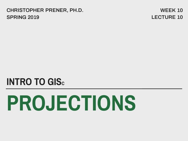 Slides for Lecture 10 of the Saint Louis University Course Introduction to GIS. These slides introduce concepts related to projecting spatial data, including projected coordinate systems and techniques for projecting tabular data that includes x,y coordinates.