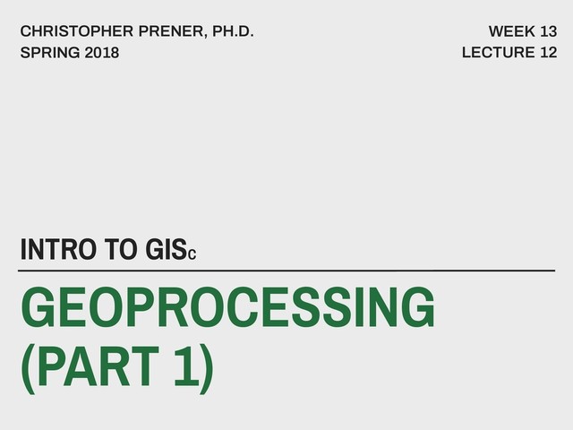 Slides for Lecture 12 of the Saint Louis University Course Introduction to GIS. These slides introduce concepts related to geoprocessing data, including select by area, clip, and dissolve operations.