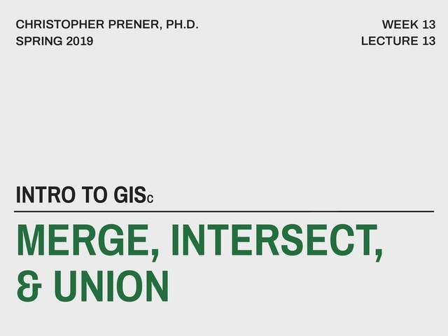 Slides for Lecture 13 of the Saint Louis University Course Introduction to GIS. These slides introduce concepts related to geoprocessing data, including merging, intersecting, and unioning features.