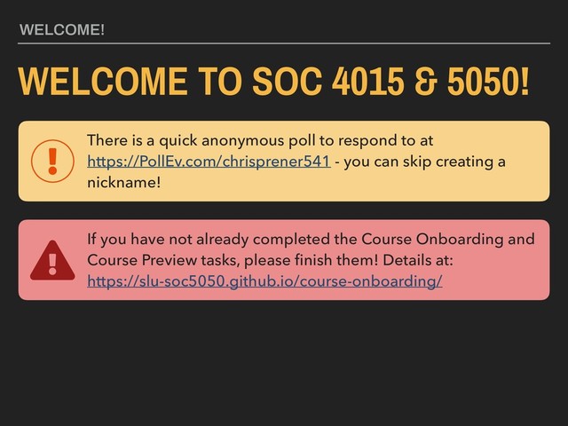 https://PollEv.com/chrisprener541 - you can skip creating a nickname! If you have not already completed the Course Onboarding and Course Preview tasks, please finish them! Details at: https://slu-soc5050.github.io/course-onboarding/ WELCOME! WELCOME TO SOC 4015 & 5050!