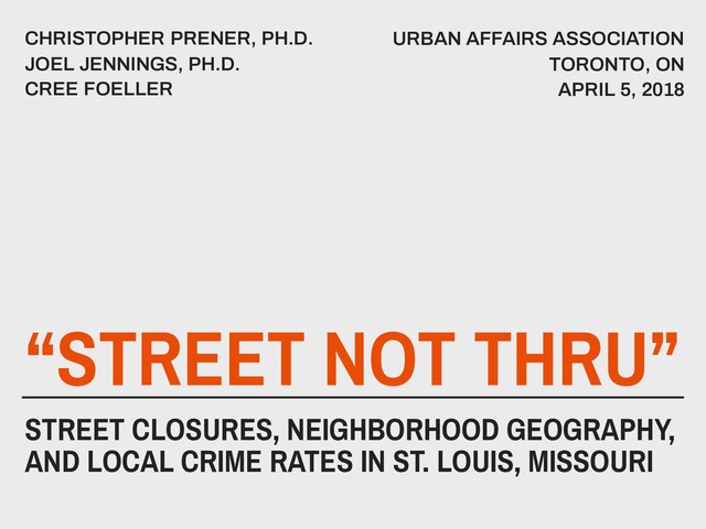 This presentation from the 2018 Urban Affairs Association annual meeting describes the systematic closure of streets in St. Louis, Missouri. We also present initial analyses showing that, at the city block level, higher numbers of closures are not associated with lower levels of crime.