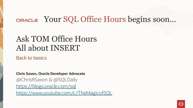 c7, c8, c9, c10, c11, c12, c13, c14, c15, c16, c17, c18, c19, c20, c21, c22, c23, c24, c25, c26, c27, c28, c29, c30, c31, c32, c33, c34, c35, c36, c37, c38, c39, c40, c41, c42, c43, c44, c45, c46, c47, c48, c49, c50, c51, c52, c53, c54, c55, c56, c57, c58, c59, c60, c61, c62, c63, c64, c65, c66, c67, c68, c69, c70, c71, c72, c73, c74, c75, c76, c77, c78, c79, c80, c81, c82, c83, c84, c85, c86, c87, c88, c89, c90, c91, c92, c93, c94, c95, c96, c97, c98, c99, c100 ) values ( v1, v2, v3, v4, v5, v6, v7, v8, v9, v10, v11, v12, v13, v14, v15, v16, v17, v18, v19, v20, v21, v22, v23, v24, v25, v26, v27, v28, v29, v30, v31, v32, v33, v34, v35, v36, v37, v38, v39, v40, v41, v42, v43, v44, v45, v46, v47, v48, v49, v50, v51, v52, v53, v54, v55, v56, v57, v58, v59, v60, v61, v62, v63, v65, v64, v66, v67, v68, v69, v70, v71, v72, v73, v74, v75, v76, v77, v78, v79, v80, v81, v82, v83, v84, v85, v86, v87, v88, v89, v90, v91, v92, v93, v94, v95, v96, v97, v98, v99, v100 ) Copyright © 2021 Oracle and/or its affiliates | @ChrisRSaxon * blogs.oracle.com/sql * www.youtube.com/c/TheMagicofSQL
