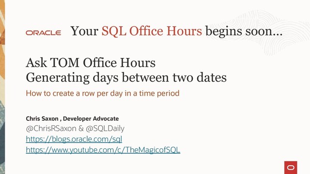 to create a row per day in a time period Chris Saxon , Developer Advocate @ChrisRSaxon & @SQLDaily https://blogs.oracle.com/sql https://www.youtube.com/c/TheMagicofSQL Your SQL Office Hours begins soon…