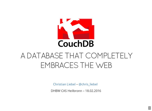 (i.e. in the browser or Node.js) Emulates CouchDB’s API Data is stored locally (IndexedDB/Web SQL) Sync to CouchDB/offline support Asynchronous API (Promise-based) http://pouchdb.com
