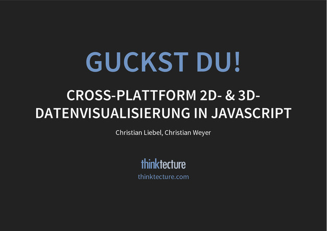 Zahlen und Ziffern, schwarz auf weiß, sind für sich genommen ziemlich langweilig und oftmals nur bedingt aussagekräftig. Es bedarf einer Visualisierung, um Zusammenhänge verstehen und Daten vergleichen zu können. Mit Web-Technologien stehen Ihnen hierfür mehr Möglichkeiten zur Verfügung denn je. Neben 2D-Diagrammen können Sie mithilfe von WebGL auch interaktive dreidimensionale Darstellungen plattformübergreifend realisieren – im Browser und Touch-optimiert auf mobilen Endgeräten. Christian Weyer und Christian Liebel zeigen Ihnen in dieser Session, wie Sie ansprechende 2D- und 3D-Visualisierungen Cross-Plattform implementieren und in existierende Anwendungen einbetten können.