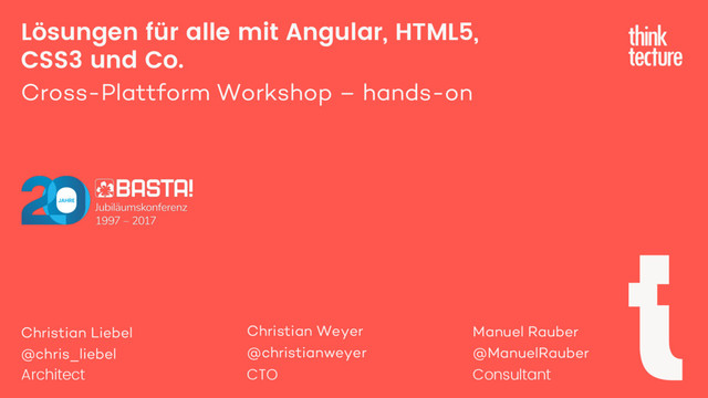 HTML5 und Frameworks wie Angular haben die Karten bei der Anwendungsentwicklung bereits vor ein paar Jahren komplett neu gemischt. Das Web enthält viel mehr als nur neue Struktur- und Formularelemente oder die Wiedergabe von Audio und Video ohne Plug-in – und läuft zudem auf allen denkbaren Plattformen. Im Zusammenspiel mit TypeScript und CSS3 bringt HTML5 viele Funktionen, die lange Zeit nur nativen Anwendungen vorbehalten waren, auch ins Web: Offlinefähigkeit, clientseitige Datenhaltung, 2-D- und 3-D-Animationen oder standortbezogene Dienste sind nur wenige Beispiele für die neuen Möglichkeiten, die sich durch den Webstandard eröffnen. Über Cordova kann eine einmal bspw. mit Angular geschriebene App mit einem Mausklick für viele verschiedene Plattformen gebaut werden. Christian Liebel, Manuel Rauber und Christian Weyer zeigen Ihnen anhand eines Beispiels, wie und mit welchen Tools ansprechende Apps auf Basis von HTML5 und Angular heute entwickelt werden, ohne auf Touchinteraktion, flüssige Effekte oder native Funktionen verzichten zu müssen. Und Sie programmieren aktiv mit – bis zum fertigen App-Paket für verschiedenste Plattformen.