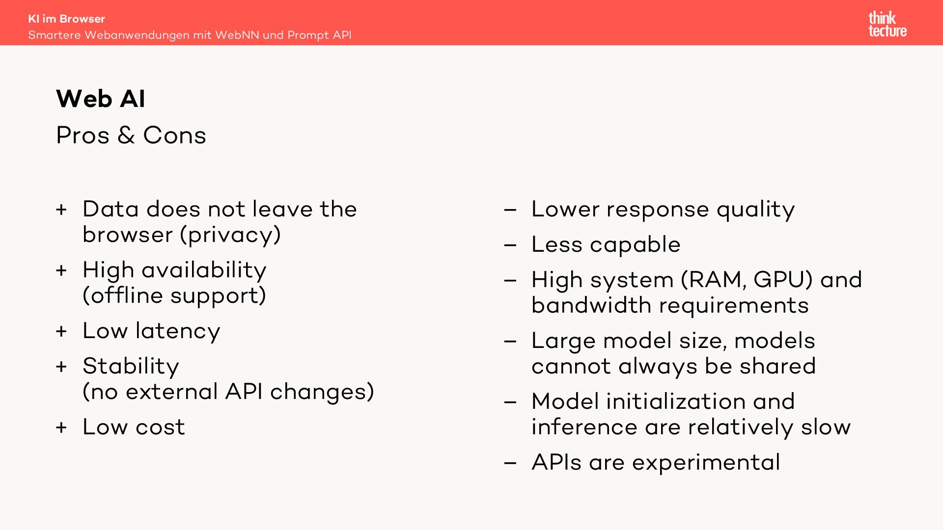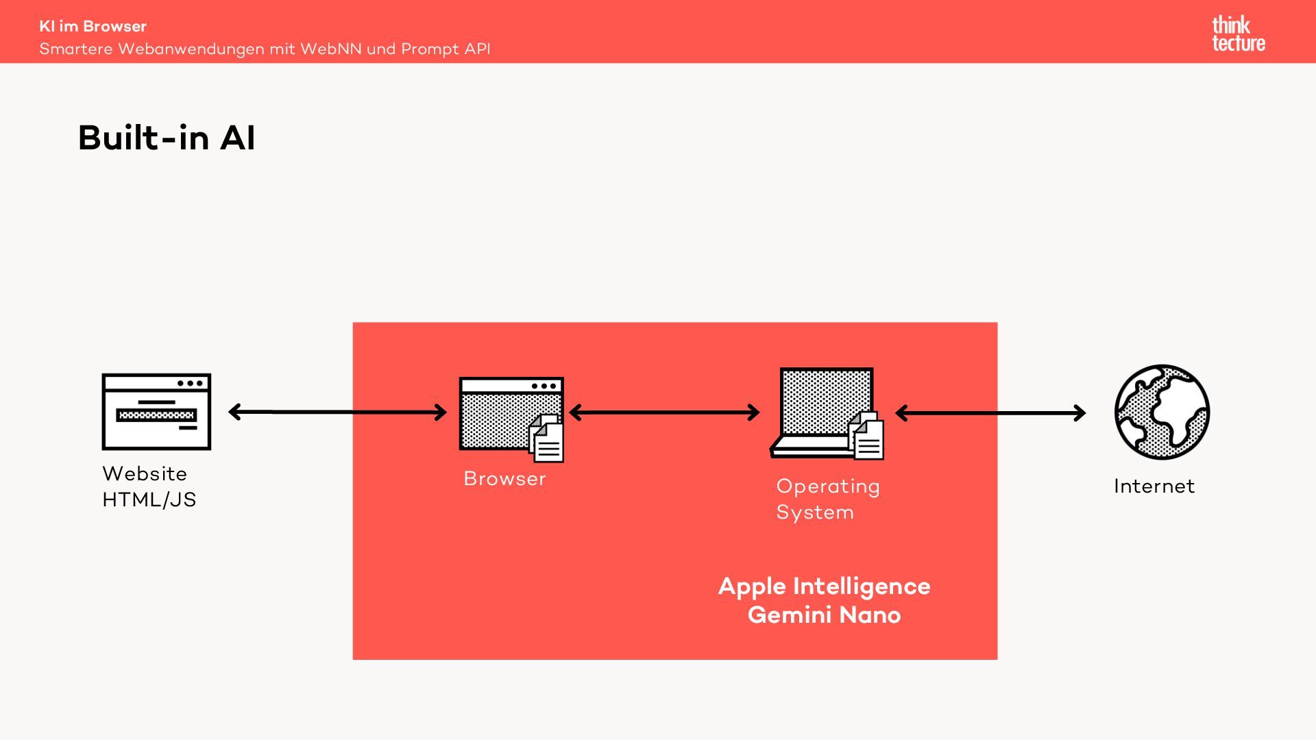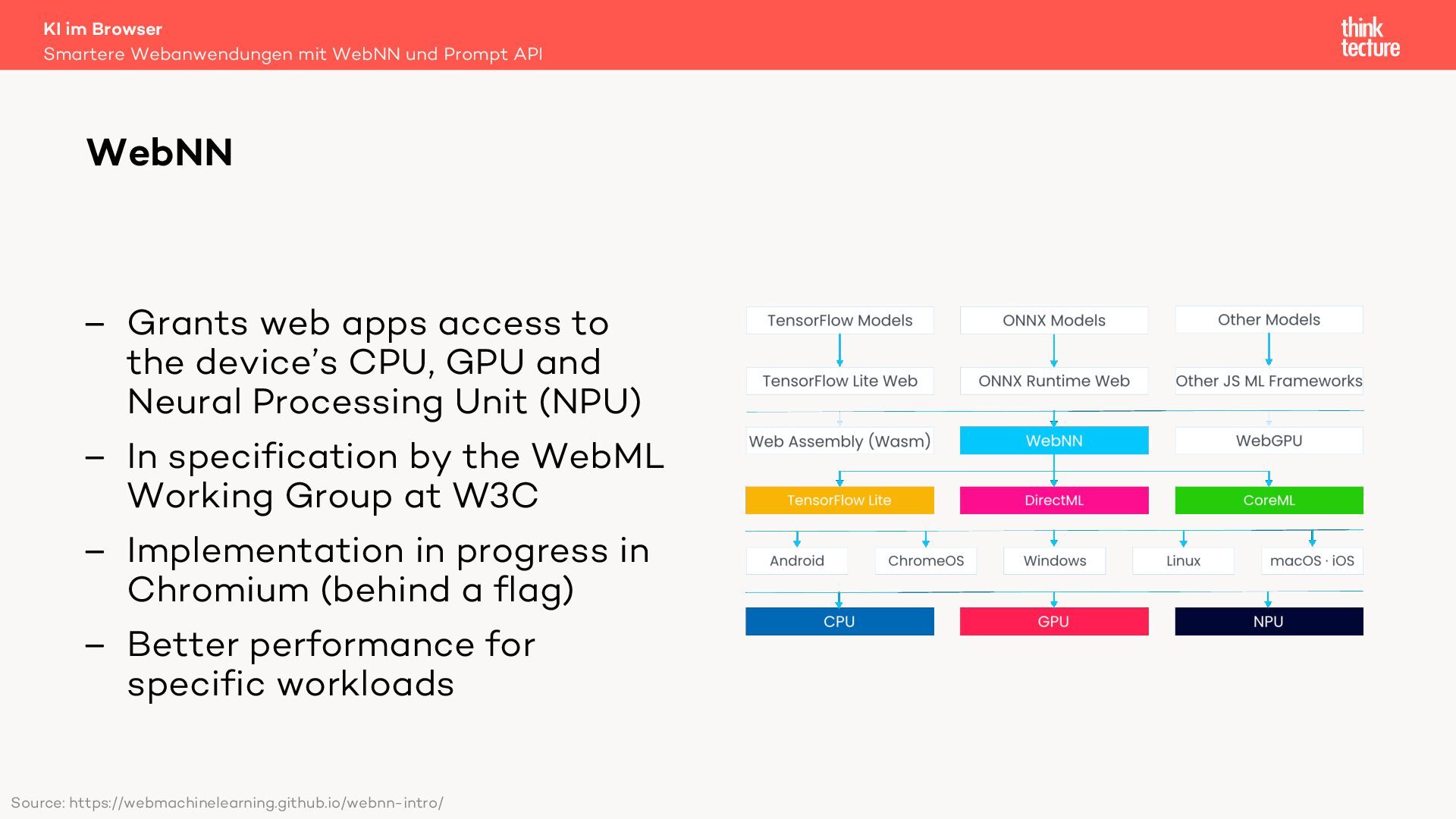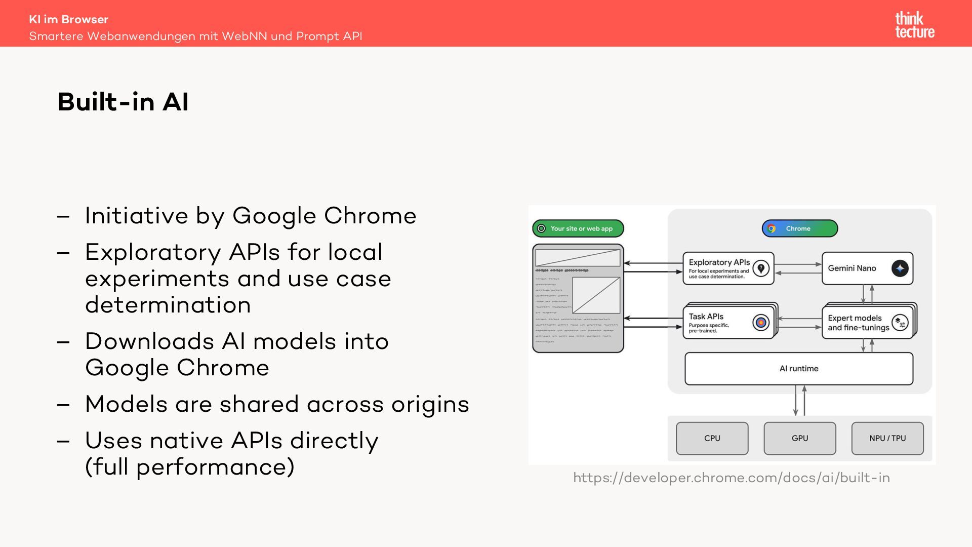 In dieser Session werden wir die Integration generativer KI-Funktionen in Webanwendungen unter Verwendung der Prompt API und der Web Neural Network (WebNN) API diskutieren. Diese APIs ermöglichen die Ausführung von Large Language Models (LLMs) auf dem Gerät des Benutzers. Zu den Hauptvorteilen der lokalen Ausführung gehören die Offlineverfügbarkeit und die Datensicherheit – vorausgesetzt, das Gerät der Benutzerinnen und Benutzer verfügt über ausreichende Leistung, um die KI-Modelle auszuführen.