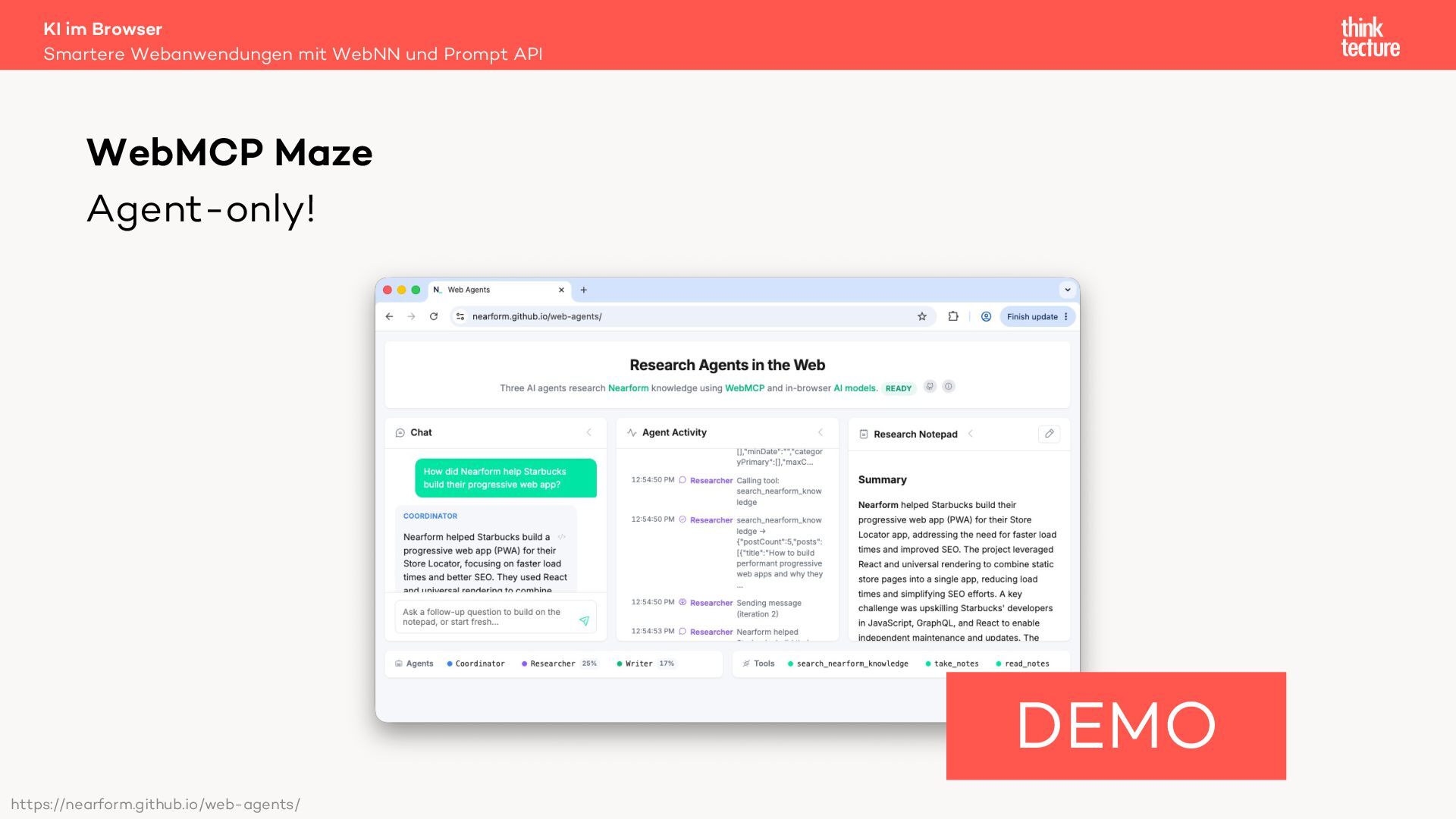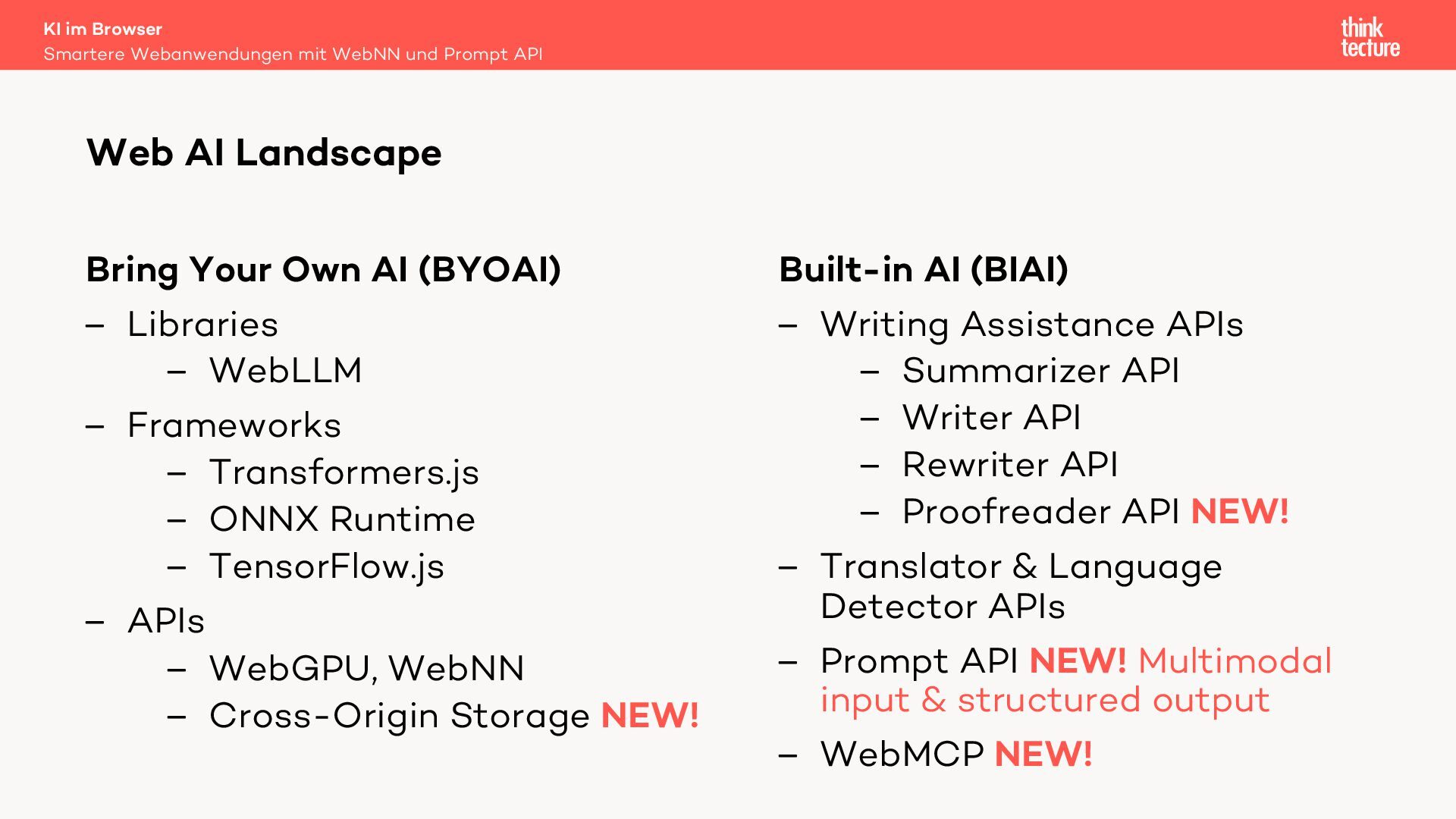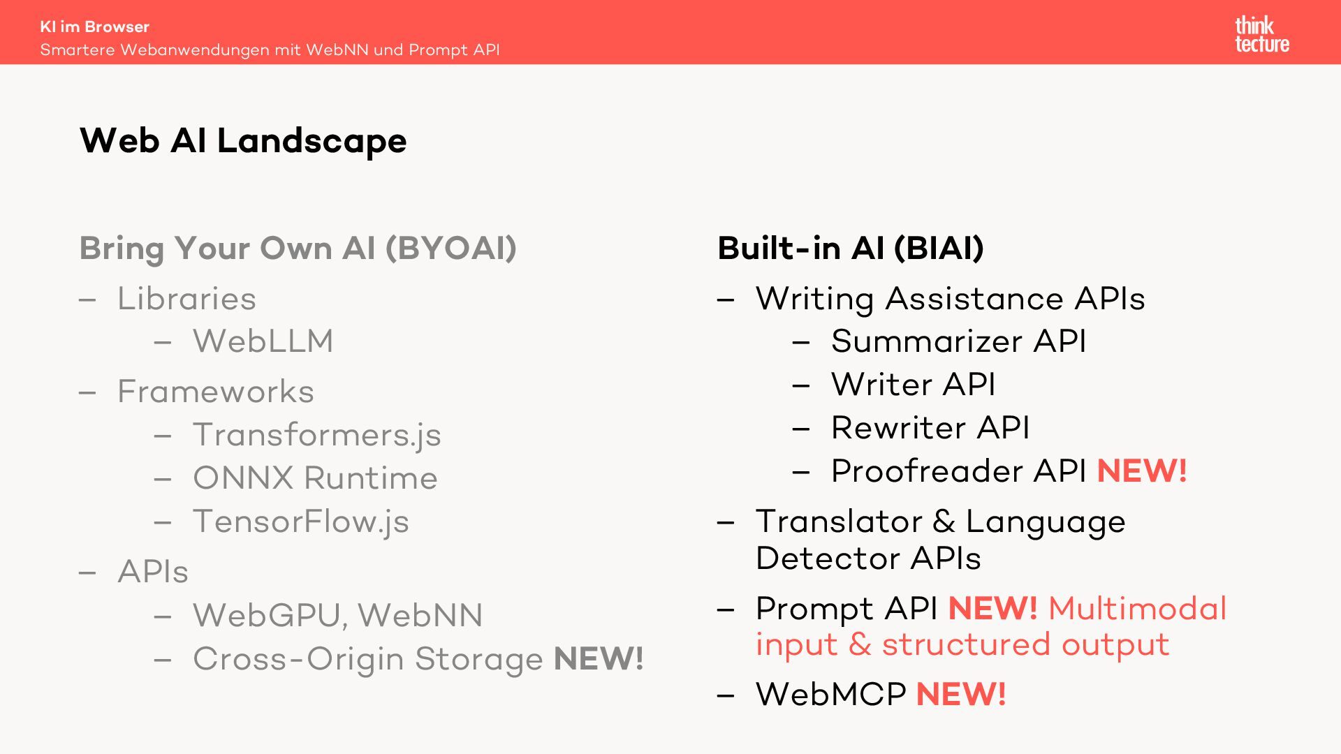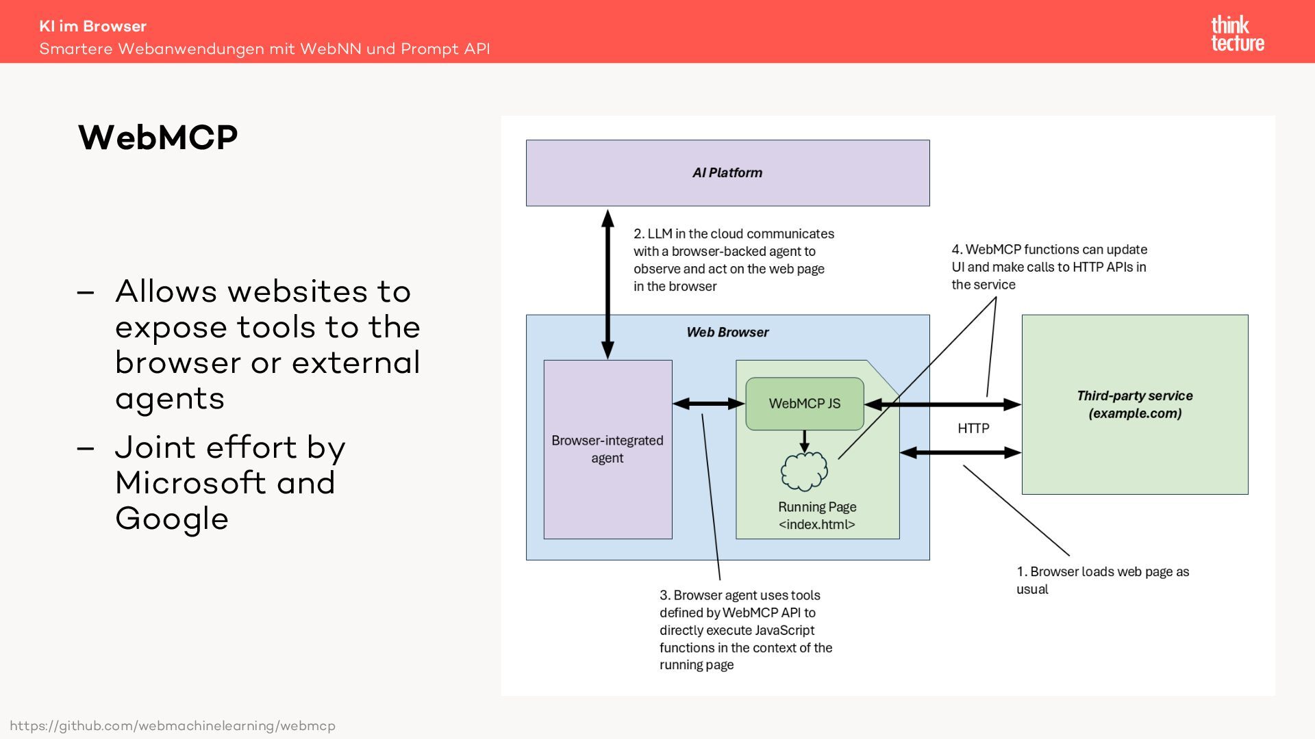 In dieser Session werden wir die Integration generativer KI-Funktionen in Webanwendungen unter Verwendung der Prompt API und der Web Neural Network (WebNN) API diskutieren. Diese APIs ermöglichen die Ausführung von Large Language Models (LLMs) auf dem Gerät des Benutzers. Zu den Hauptvorteilen der lokalen Ausführung gehören die Offlineverfügbarkeit und die Datensicherheit – vorausgesetzt, das Gerät der Benutzerinnen und Benutzer verfügt über ausreichende Leistung, um die KI-Modelle auszuführen.