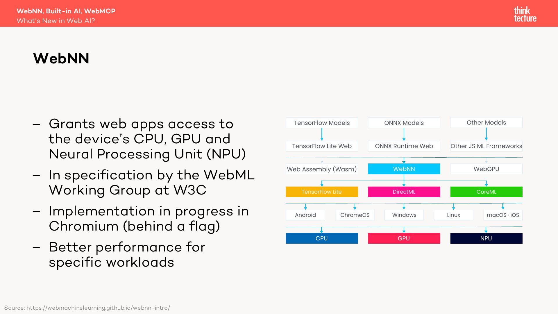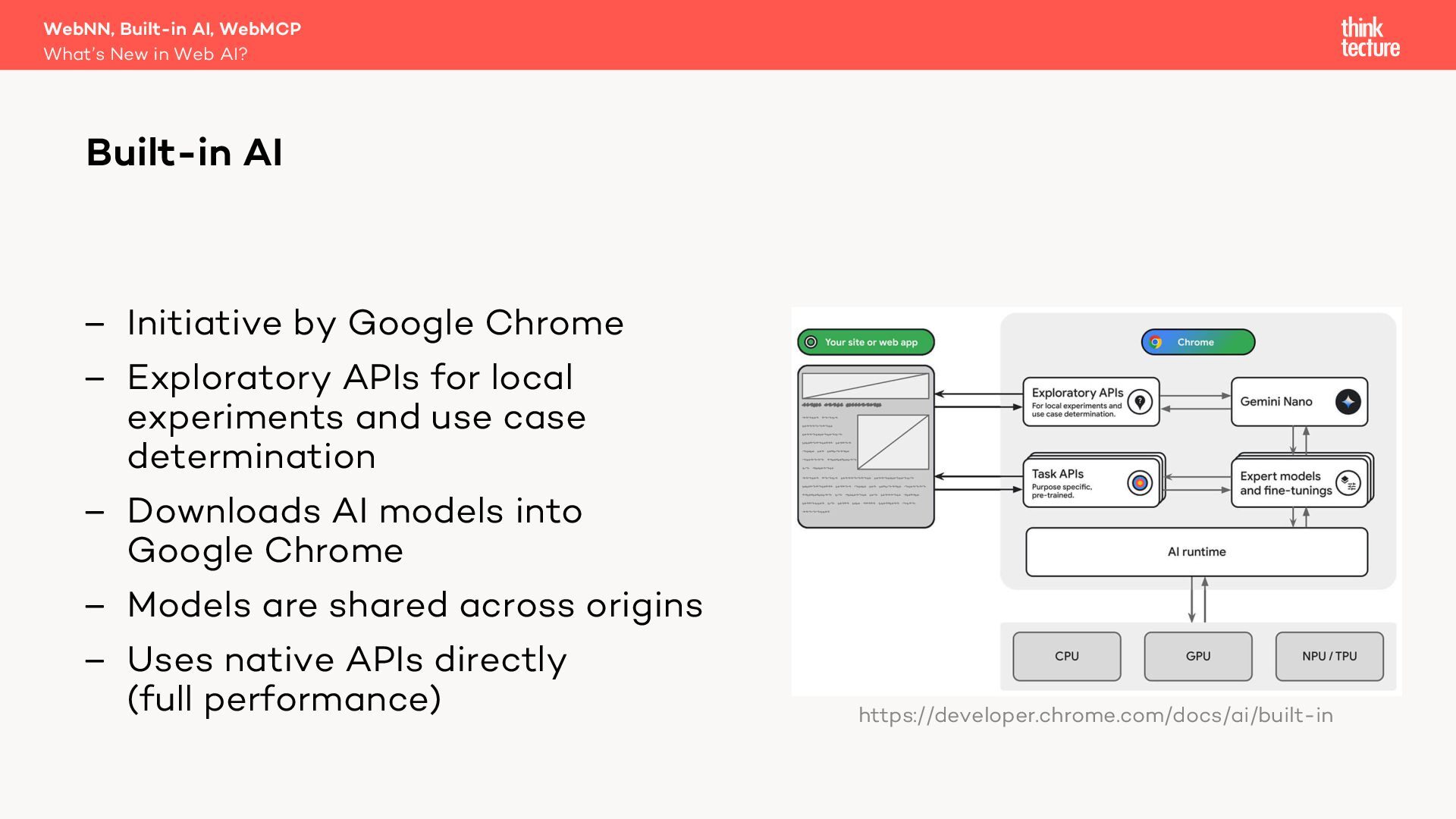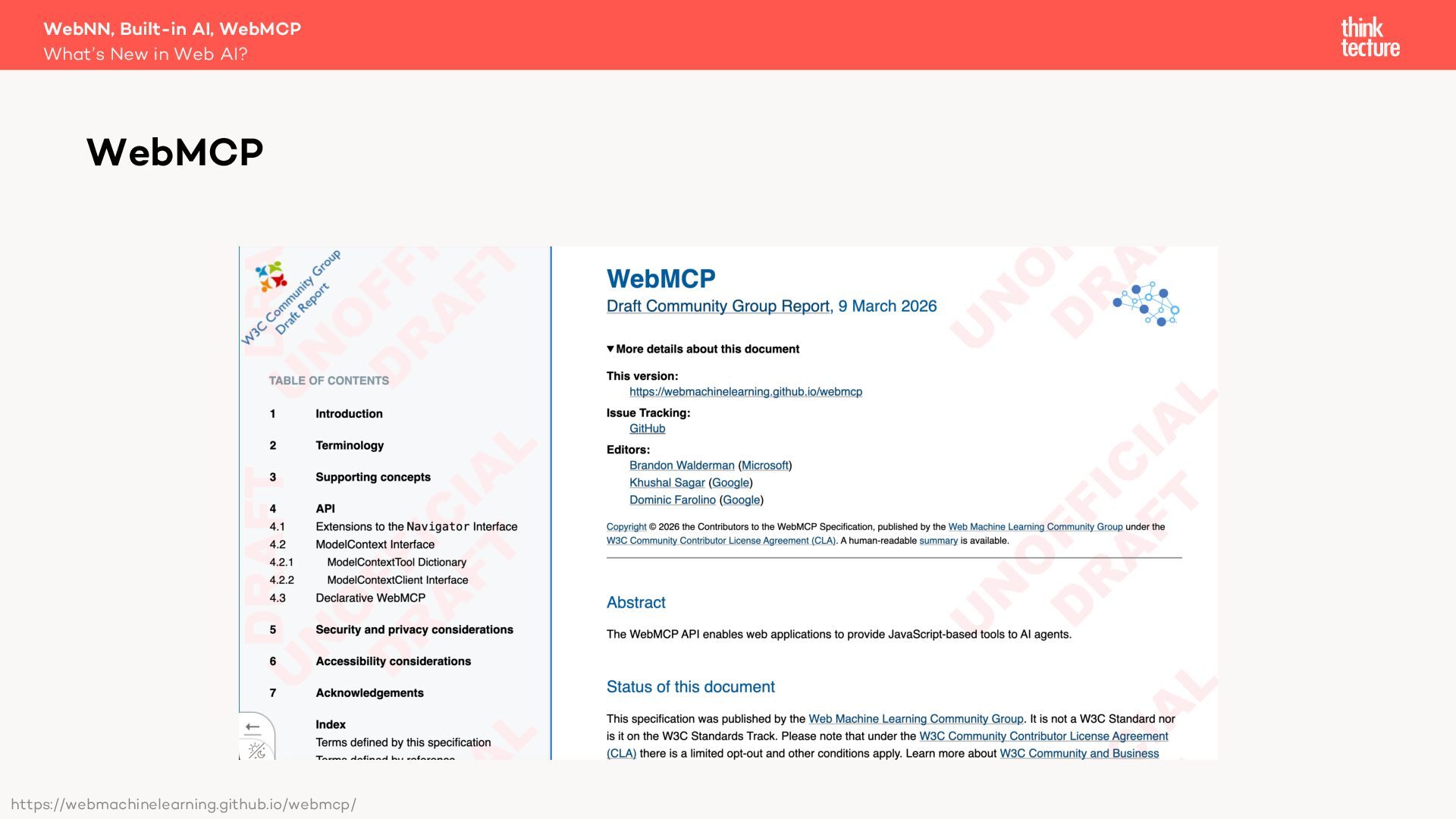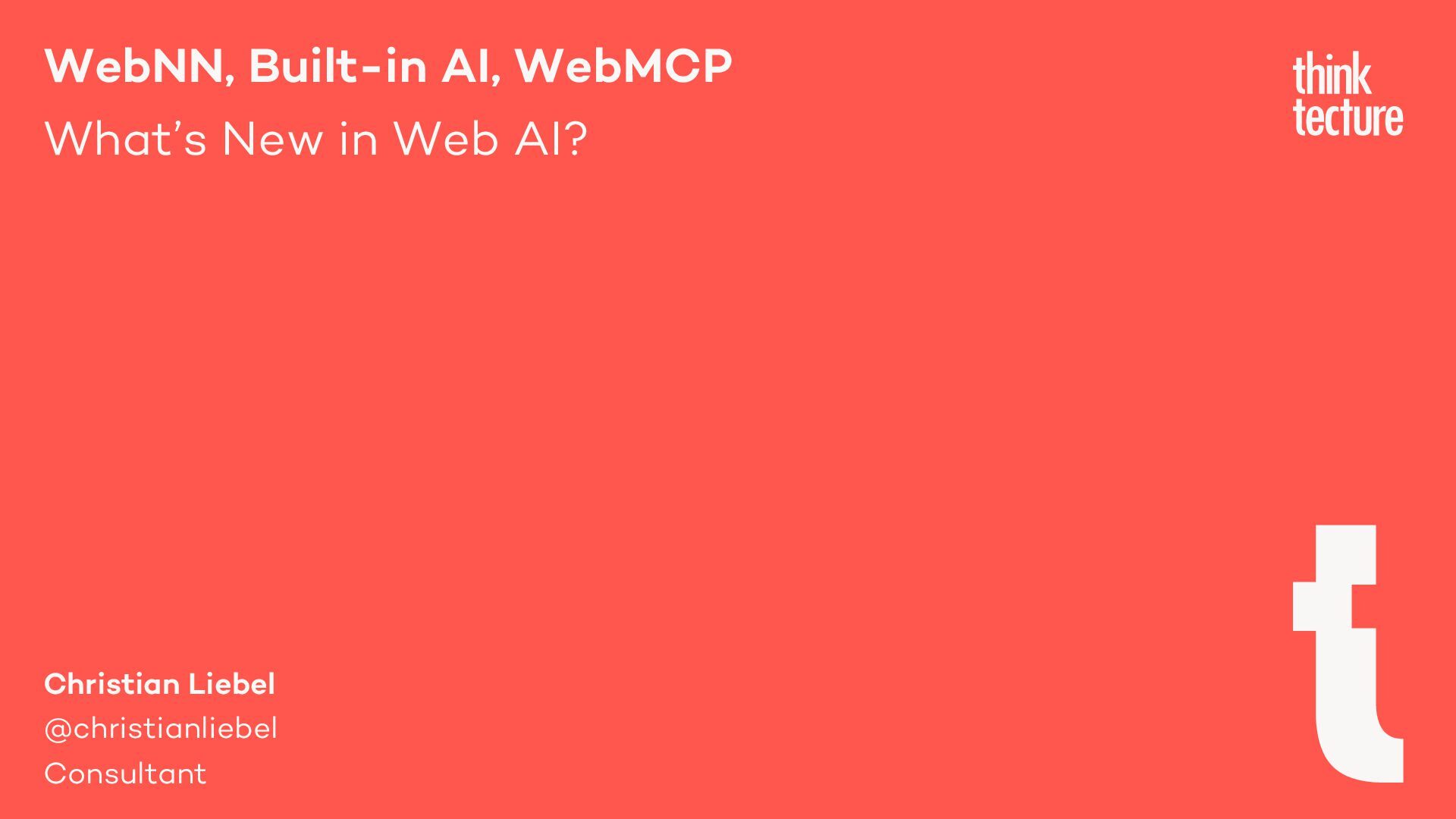 Generative AI is becoming a key part of modern software architecture, and its presence in web apps is growing. As demand increases, vendors and specification authors are working to make AI capabilities more accessible and integrated into the web platform. In this session, Christian Liebel—member of the W3C TAG and WebML Working Group—will share what's cooking behind the scenes in Web AI. You'll get an update on the latest advancements in the WebNN API, Chromium's Built-in AI APIs, WebMCP, emerging developer tools, usage statistics, and the real-world challenges that browser vendors and standards authors are navigating to bring AI to the web.