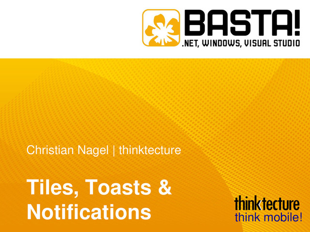 Der erste Eindruck der User einer Windows-Store-App ist die Kachel. Sie kann weit mehr als nur ein Icon zeigen. Aktuelle Informationen können kontinuierlich, aber auch über Push Notification angezeigt werden. Mit Toasts sind Benachrichtigungen auch möglich, wenn die Kachel nicht sichtbar ist. Diese Session bietet alles zu Tiles, Badges und Toasts, Möglichkeiten und Einschränkungen.