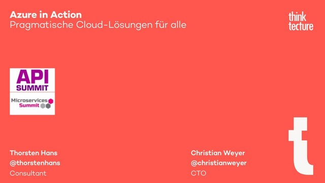 IDE öffnen, „File – New Project – Cloud“, OK klicken und fertig. Oder? Nun, nicht ganz. Denn egal ob AWS, GCP oder eben Azure: am Ende des Tages werden Sie sich fragen, warum, wann und wie gehe ich in die Cloud? Genau diese Fragestellungen wollen Thorsten Hans und Christian Weyer für Java-, node.js- und .NET-Entwickler in diesem Workshop beantworten. Anhand diverser Use Cases werden mögliche Wege mit, über und in Azure diskutiert. Was bedeuten Architekturansätze wie Cloud-Native Microservices und Serverless Microservices? Wie gehe ich bei Brownfield-Projekten vor und wie kann ich Greenfield-Lösungen effizient in Azure realisieren? Wo liegen Unterschiede und Benefits von datengetriebenen und von ereignisgetriebenen Ansätzen? Wie kann ich mit dem Sammelsurium an Patterns, Technologien und Tools in Azure kosteneffektiv hantieren und dennoch flexibel sein? All dies werden wir anhand praktischer Beispiele und pragmatischer Lösungen in interaktiver Art und Weise adressieren. Sehen Sie PaaS, Web Apps, Containers, Orchestrators, Serverless, Functions & Co. mit der Azure-Cloud anhand von .NET- und node.js-Demos in Action. (Bringen Sie gerne Ihre „eigenen Probleme“ mit und lassen Sie uns darüber reden.)