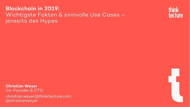 Personal focus on § Mobile & web-based application architectures § Interoperability, cross-device § Pragmatic end-to-end solutions § Cloud-native & serverless architectures § Independent Microsoft Regional Director § Microsoft MVP for ASP.NET (Architecture) ASPInsider, AzureInsider § Google GDE for Web Technologies [email protected] @christianweyer https://www.thinktecture.com Christian Weyer & Thinktecture Wichtigste Fakten & sinnvolle Use Cases – jenseits des Hypes Blockchain in 2019
