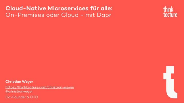 Microservices-all-the-things! Jaja, wir haben es gehört. Lassen Sie uns in dieser Session über pragmatische Wege zum Entwerfen und Implementieren servicebasierter Architekturen sprechen, die mitunter über die reinen „By-the-book“-Ansätze hinausgehen. Mit der beispielhaften, aber kritischen Verwendung der Open-Source-Lösung Dapr zeigt Christian Weyer, wie man durch Nutzung bewährter Cloud-Native Design Patterns primär Zeit auf das Implementieren von Features & Geschäftslogik konzentrieren kann und nicht auf die Infrastruktur drum herum. Sehen Sie auch, wie [Micro-]Services in einem Spektrum von Ausführungsumgebungen betrieben werden können, von selbst gehosteten lokalen Umgebungen bis hin zu supercoolem serverlosem Azure.
