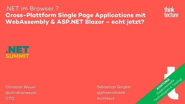 on § Mobile & web-based application architectures § Pragmatic end-to-end solutions § Cloud-native architectures § Microsoft MVP for ASP.NET (Architecture) ASPInsider, AzureInsider § Google GDE for Web Technologies § [email protected] § ! @christianweyer § Consultant & Architect at Thintecture AG § Focus on § Flexible and scalable backend architectures § Developer productivity § Software Quality measures § All things .NET § [email protected] § ! @phoenixhawk Cross-Plattform Single Page Applications mit WebAssembly & ASP.NET Blazor .NET im Browser Christian Weyer Sebastian Gingter