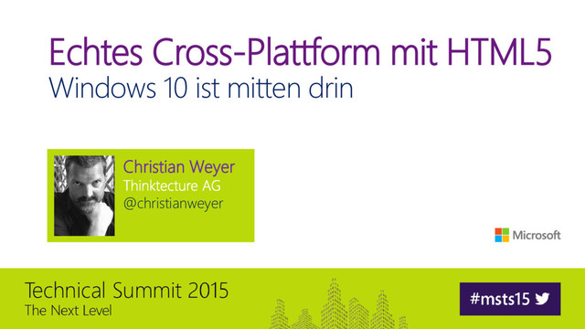 Sehen Sie in dieser Session die genannten Technologien und Werkzeuge in Aktion. Lernen Sie zudem was Hosted Web Apps in Windows 10 sind und wie sich diese von anderen Bereitstellungsmodellen unterscheiden. Christian Weyer freut sich auf Ihren Besuch und hofft auf eine kurzweilige Session – gemeinsam mit Ihnen.