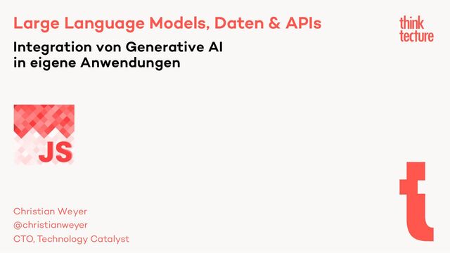 Menschliche Sprache als Universal Interface für Software-Lösungen - hört sich spannend an! Jenseits des ChatGPT-Hypes taucht Christian in die Welt der Large Language Models (LLMs), Daten und APIs ein und konzentriert sich darauf, wie man AI-Funktionalität sinnvoll in eigene Anwendungen integrieren kann. Wir werden pragmatische Szenarien und Use Cases untersuchen, die das Potenzial von LLMs (wie GPT oder Llama) demonstrieren - und erörtern, wie AI-Techniken in bestehende Architekturen einbezogen werden können. Die Teilnehmer erhalten erste Einblicke in Frameworks wie LangChain aus der Python-Welt zur Programmierung LLM-basierter Systeme. Zudem werden wir darauf eingehen, nicht nur Closed-Source-Systeme (wie OpenAI) zu nutzen, sondern auch Open-Source-Optionen (wie Llama) in Betracht zu ziehen, um unterschiedlichen Anforderungen gerecht werden zu können. (Und nein, dieser Abstract wurde nicht von ChatGPT geschrieben.)