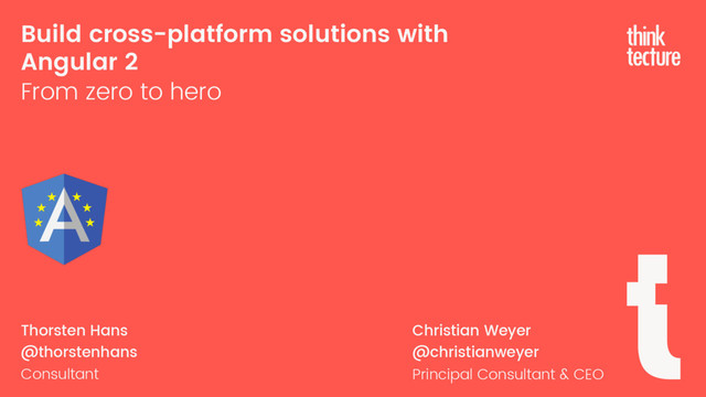 Targeting just the desktop or mobile as a single platform isn’t enough these days. Customers want to use all their devices to get their work done. As business application developers it’s time to address those demands by providing apps for all platforms, whether you think about mobile, desktop or the pure web. In this workshop Christian Weyer and Thorsten Hans will explain which architectural concepts and ideas will build up the foundation for your upcoming cross-platform application. Come and build such an application with Angular 2 and bring a single codebase to all desktop platforms (such as Windows Store, classic Windows Desktop, MacOSX and Linux), all mobile platforms (like iOS, Android and Windows Mobile) - and of course the web browser. Wanna get your hands dirty? Join our workshop!