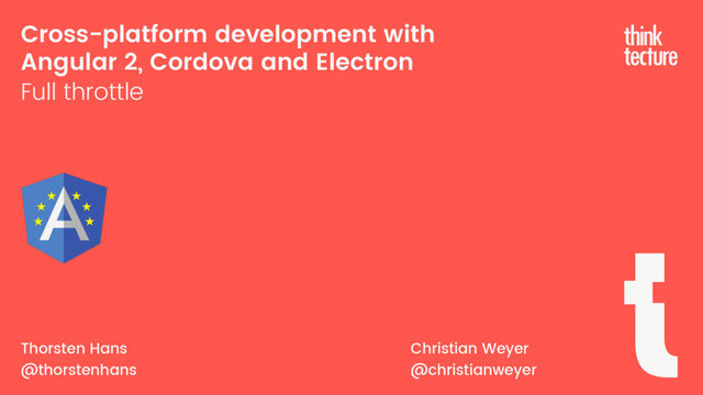 Fasten your seatbelt and join the Angular 2 Cross Platform race! In this talk you'll see how to bring your Angular applications to any platform using the browser, Apache Cordova and GitHub Electron. Join Christian Weyer and Thorsten Hans on the road trip from the web, over mobile devices to all major desktop platforms - with Angular 2 as the engine and GulpJS as the fuel.