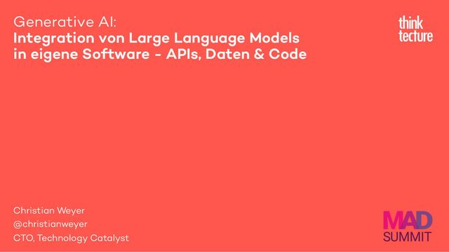 Jajaja, der ChatGPT-Wahnsinn. Einfach Text in ein Chat-Fenster tippen und staunen ... Jo, nice. Aber was ist das wirklich Interessante daran für uns Softwarearchitekten und -entwickler? Christian zeichnet in dieser Night Session jenseits des aktuellen Hypes ein Bild, in dem Large Language Models (LLMs) und die menschliche Sprache ein wichtiger und zentraler Bestandteil zukünftiger Softwarelösungen sein kann. Die Mächtigkeit semantischer Schnittstellen via LLMs, gepaart mit klassischen Daten-Architekturen, APIs und Workflows, eröffnet interessante Use Cases für die Mensch-Maschine- respektive Mensch-Code-Interaktion. Die Session bringt die neuen Ideen von generativer AI & Large Language Models in Einklang mit existierenden Architekturansätzen, damit wir als Developer das mögliche Potenzial für künftige Lösungen und Produkte besser einschätzen können.