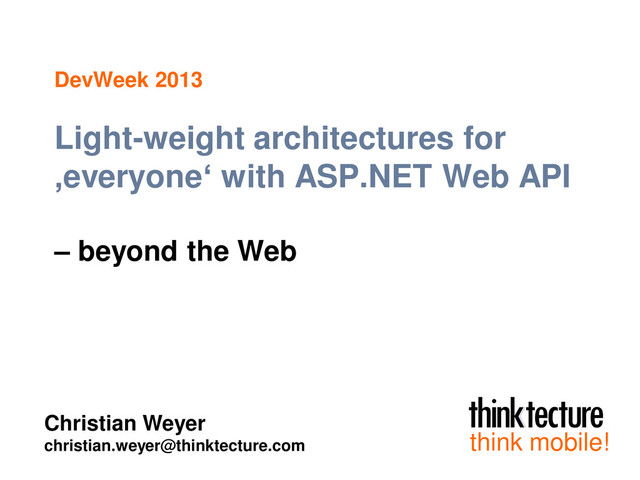 Service orientation, SOAP and maybe WCF are now part of the tool box for distributed applications. But nowadays some rethinking is required. The triumphant advance of mobile devices and an increased drive towards open architectures may not quite fit the ‘traditional’ implementation of service-orientation. In this talk, Christian Weyer shows how to architecturally meet those new requirements and introduces you to the world of lightweight web APIs. Based on the new ASP.NET Web API stack, you will see how to implement web APIs and consume them in various client applications.