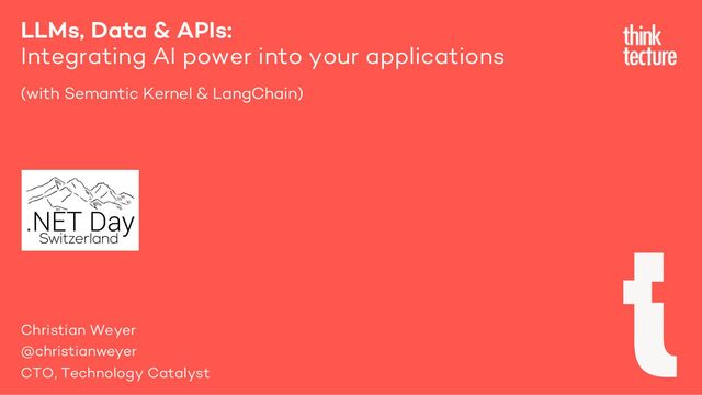 Let's look beyond the ChatGPT hype! In this session, Christian delves into the world of Large Language Models (LLMs), data, and APIs - focusing on how to integrate AI capabilities seamlessly into your .NET-based applications. We will explore practical use cases that demonstrate the potential of LLMs (such as GPT) and discuss how to incorporate AI techniques into existing applications and architectures. Attendees will gain insights into Microsoft's Semantic Kernel tooling for .NET developers, as well as a glimpse into alternative solutions like LangChain. Lastly, we will address the importance of not only leveraging cloud-based and closed-source systems (like OpenAI) but also considering on-premises and open-source options to accommodate diverse organizational needs. Come in and find out!