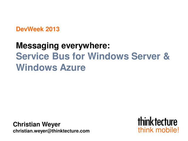 Sending and receiving messages in software systems is the preferred method if you want to loosely couple systems, to achieve better isolation or greater scalability – whether it is large or small architectures. Christian Weyer shows how to use Microsoft’s Service Bus with its queues, topics, and publish/subscribe features to realize messaging solutions. He explains the basic architecture model, illustrated with common design patterns, and how to implement it on-premises and in the Windows Azure cloud. Come and see what is possible across various platforms (desktop, web, mobile).
