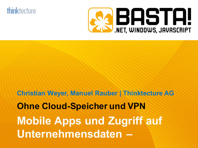 Ihre Anwender möchten moderne Businesssoftware auch auf mobilen Endgeräten benutzen? Ob im Auto, im Zug oder im Homeoffice – alles kann heute ein Arbeitsplatz sein. Cross-Plattform-Ansätze helfen bei der Erstellung von Apps, die diesen flexiblen Nutzungsanspruch unterstützen. Wie aber können diese Client-Apps auf wertvolle und schützenswerte Unternehmensdaten zugreifen? Eine Datenhaltung in der Public-Cloud kommt in vielen Fällen einfach nicht in Frage, so cool Azure und Co. auch sein mögen. In dieser Session zeigt Ihnen Christian Weyer, wie Sie sich aus modernen Apps heraus sicher lokaler Unternehmensdaten bedienen können – ohne komplexe Netzwerkinfrastruktur-Set-ups und ohne Speicherung in der Cloud. Magie? Nein, eher erprobte Technologie aus dem .NET-Umfeld gepaart mit jahrelanger Projekterfahrung. Und das Ganze ist als Open-Source-Projekt für jeden zugänglich und nutzbar.